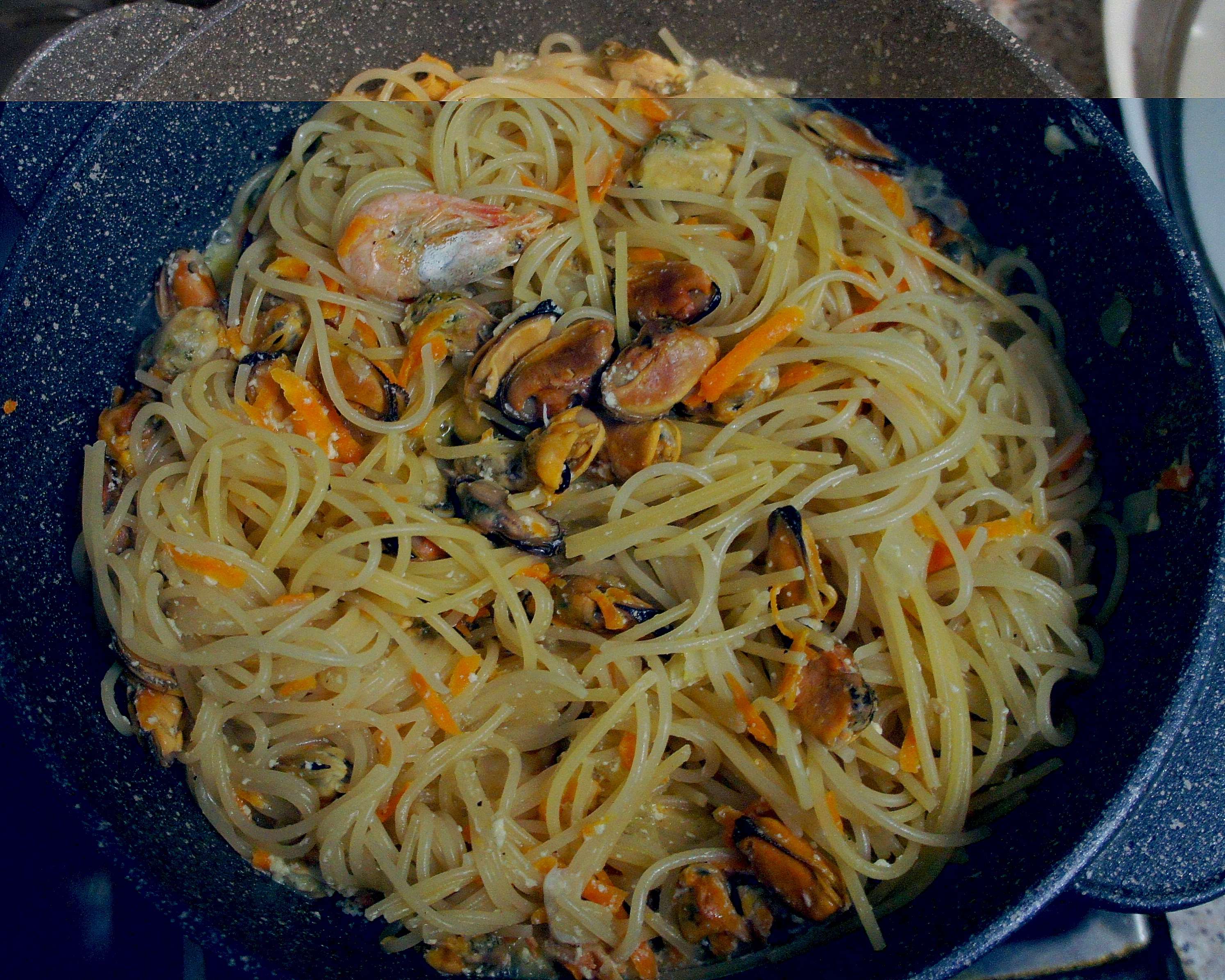 Паста с морепродуктами. Эх пармезану нема. Потру что есть и масла сливочного кусочек сверху и за стол