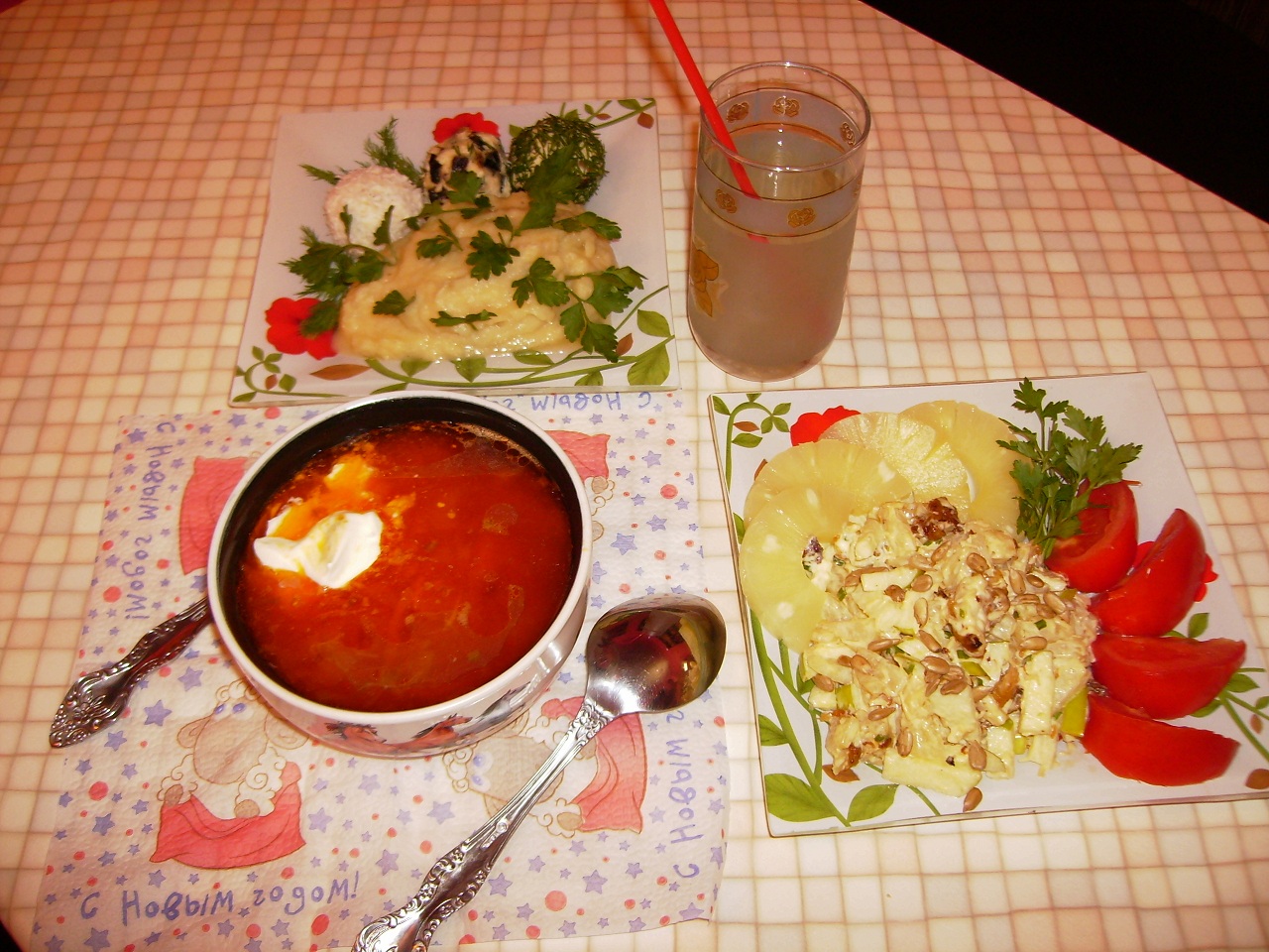 а у меня прямо сытный воскресный ужин был вчера: на первое борсчь со смятанкой на второе пюре картофельно-цветнокапустное (типо полезно) с куриными рафаэлками: а)куриное мяско с черносливом внутри в кокосовой стружке б)куриное мяско с чесноком, сыром и грибами в)куриное мяско с черносливом и зеленью на третье салат "буржуй" (рябчики с ананасами) Мелко порезаное и сильно зажаренное мяско курицы, яблоки, ананасы, украшение семечками на четвёртое - компот Облопался от пуза
