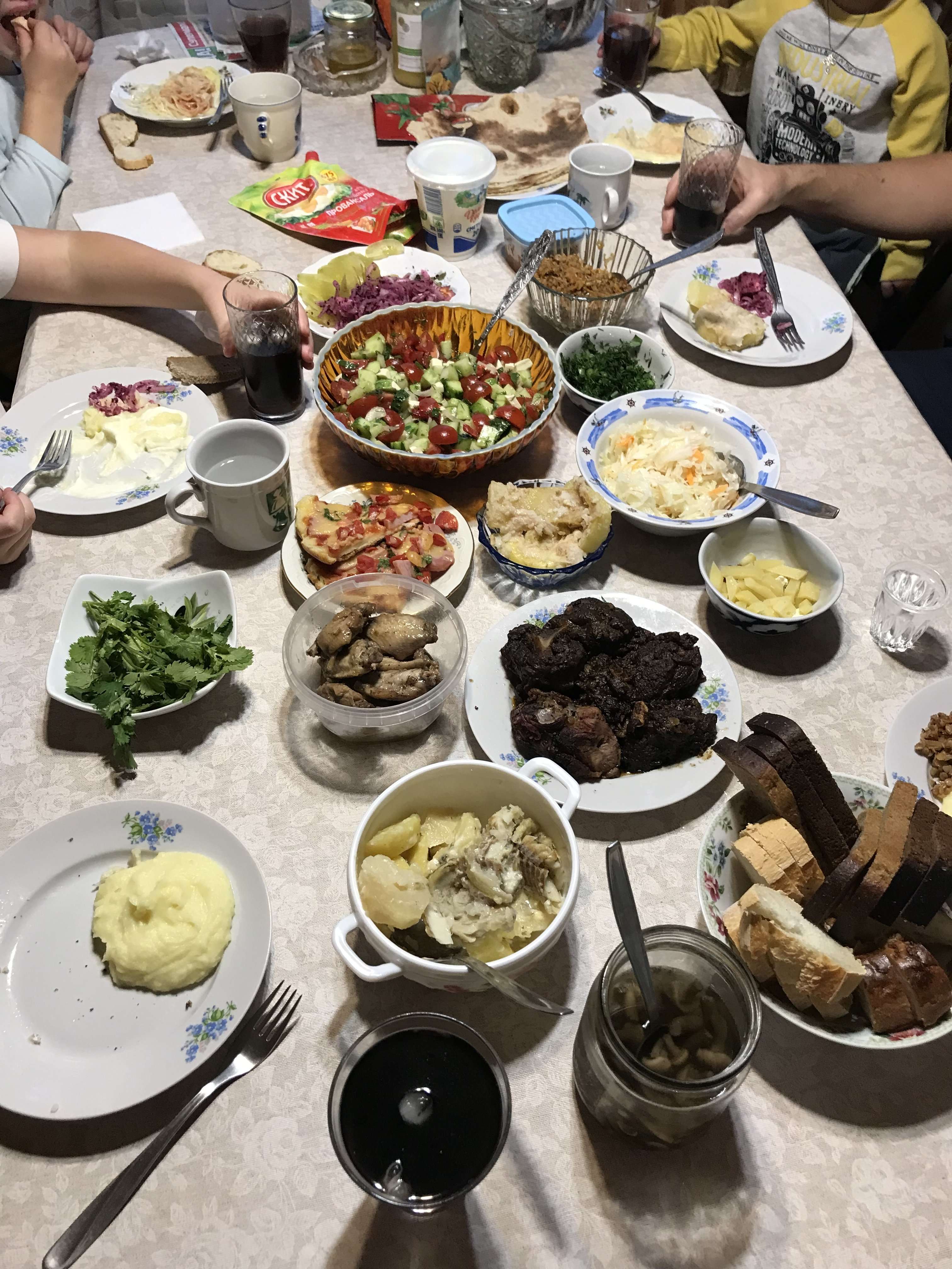 Какой котик Камень да, наверное тема. Но у меня духовка прям отлично пиццу печёт. Я когда изучала выпечку пиццы и когда купила соус мутти, поняла что самой можно и не готовить соус) Мутти классный, с ним пицца прям ну очень вкусная. И сыр кладу на соус, потом наполнение пиццы и при нет ходимости сверху немного сыра. @Вернер в теме пиццы выкладывал своё тесто, вот до него я пока не добралась попробовать, но на заметке помню стоит) У меня тут пока ничего интересного, стандартно салат да макароны детям с котлетами) Но на днях пробовала бобы Эдаме. По мне бобы и бобы, а муж сказал вкусные. Он мясо не ест, видимо знает толк в бобах))) Покажу один из ужинов/обедов у свекрови, я всегда говорю С Новым Годом Я выросла так, что в тарелку каждому положил еду и на стол, съел и если захотел добавки, положил ещё из кастрюли. Я и дома так делаю. А у свекрови, да и у прабабушки, они на стол ставят всё что есть и горячее выкрадывают в тарелку общую и на стол. И вот сидишь и подкладываешь и подкладываешь себе и выкатываешься из деревни +2кг после выходных