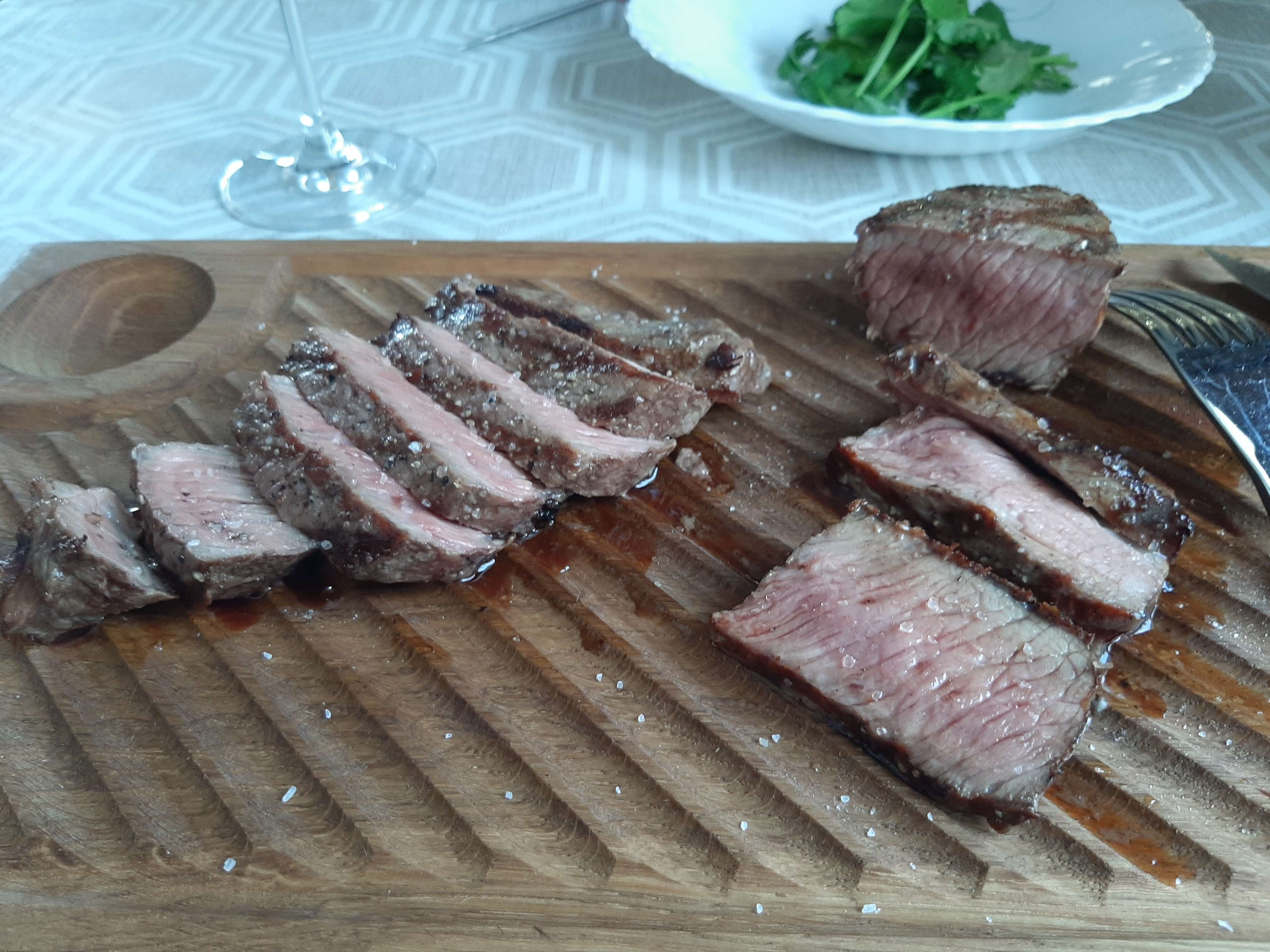 Во первых мясо нужно правильно разморозить в холодильнике. Во вторых мясо нужно выкладывать на лук. Сначала нарезать много лука, выложить лук на дно сковороды,а уже потом на лук мясо.