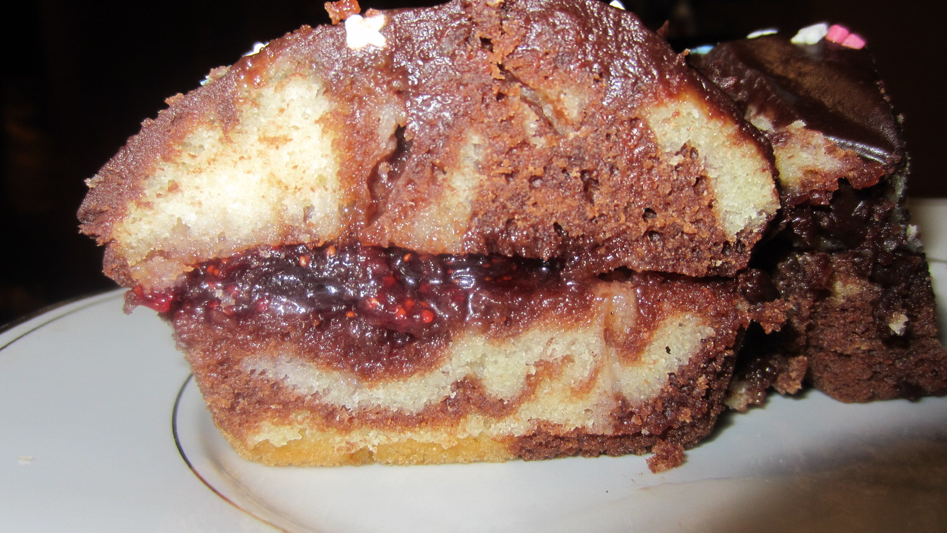 Курицу вчерашнюю доедали с печеной в фольге картошкой На сладкое кекс забацала . называется обнаружила в закромах форму и очень удивилась что она у меня есть Внутри джем клубничный, сверху пропитан коньяком и шоколадной глазурью