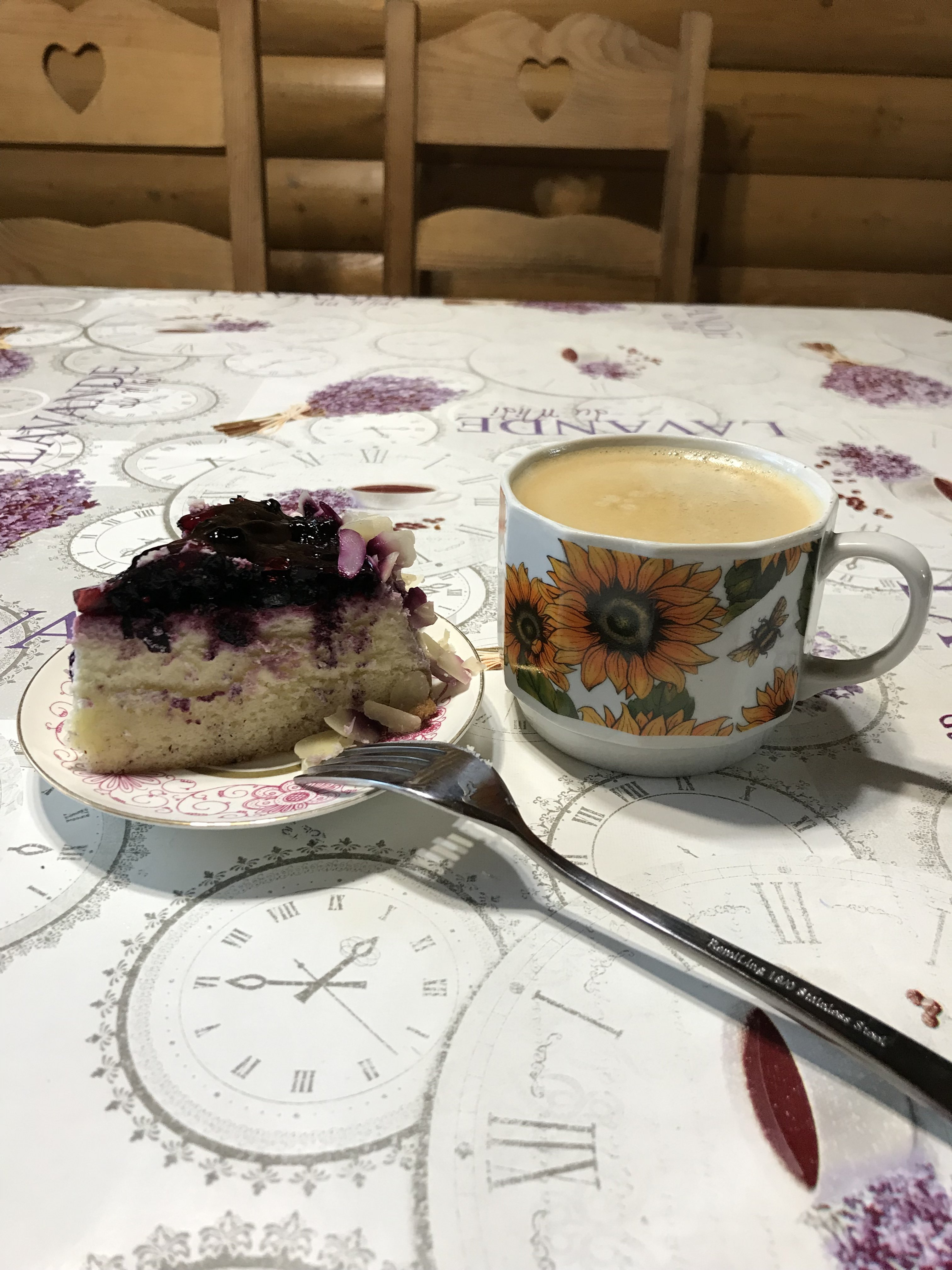 Мюсли с молоком, тосты с сыром. И кофе с чизкейком. А потом был обед На горячее пюре, курица, свинина и 40С.