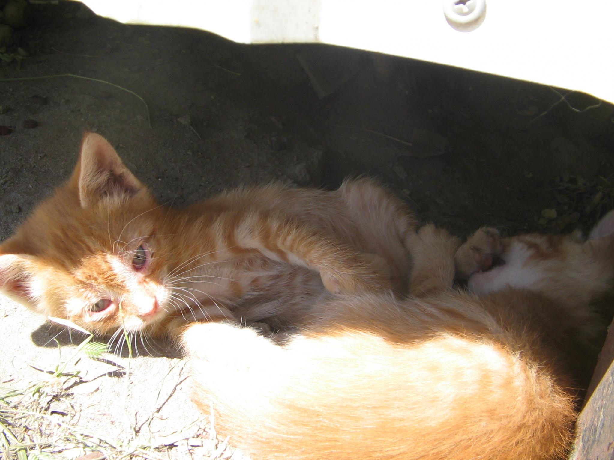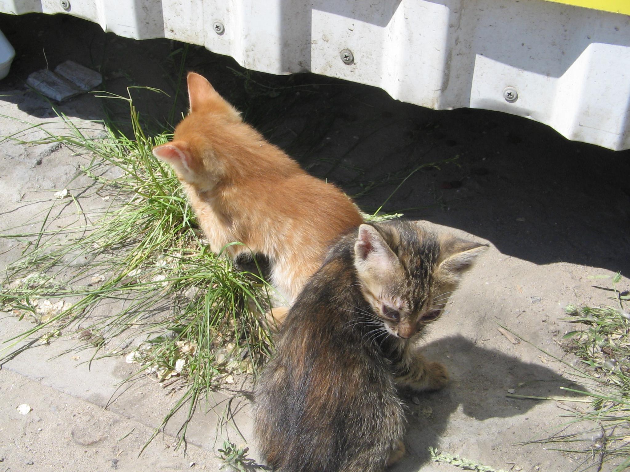 Вот такие малыши живут у мясного киоска. Изначально там было 2 кошки, которые и родили по 4 котенка с разницей в 2 дня. А потом котята перемешались, и стало у каждого котенка по 2 мамы. Это все хорошо, но вот заболела рыжая мама , " что-то с глазами", и заразила всех котят.Лечу глазки у котят левомицетиновыми каплями и тетрациклиновой мазью.Улучшения уже есть, но не совсем все отлично. Котята такие: 3 рыжих мальчика, 1 трехцветная девочка, серый мальчик, бежево-серая девочка и черепашка-девочка. Одного котенка, 8-го, уже забрали. Удалось сфотографировать только двоих, но буду добавлять новые фото. Котята еще маленькие, самостоятельно не кушают, но через 7-10 дней уже можно будет забирать. мой тел. 8-905-395-05-35, Софья.