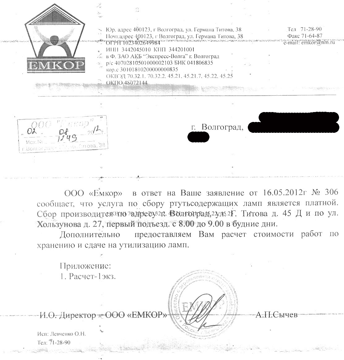 Заниматься лампами не было времени и к этой теме я вернулся лишь неделю назад. Сходил в УК и добился того, чтобы мне, наконец, пришел ответ на мой запрос по поводу утилизации ламп. Смотрите ответ в приложении. Емкор организовал два пункта сбора ламп, но утилизация ламп платная. Насчет платной утилизации я еще проконсультируюсь законно это или нет. Также пытаюсь договориться с главным энергетиком насчет того, чтобы в многоэтажках с мусоропроводами были расклеены разработанные мной плакаты (см. выше). Кроме того, мной было написано более 9000 обращений в различные СМИ. Результаты пока такие: 16.07.2012, Волгоградская правда - "Последний путь энерджайзера" http://vpravda.ru/component/k2/item/5500-последний-путь-энерджайзера 17.07.2012, Городские вести - "УК и ТСЖ игнорируют требования по утилизации ртутных ламп" http://www.gorvesti.ru/gazeta/208--...irujut-trebovanija-po-utilizacii-rtutnyh-lamp 20.07.2012, Аргументы и Факты (Волгоград) - "В Волгограде около домов хранятся ядовитые отходы" 26.07.2012, Эхо Москвы (Волгоград) - программа "Волгоградский разворот" (см. их страницу вконтакте) Не факт, конечно, что причиной публикации тех или иных статей стало мое обращение, но тем не менее.