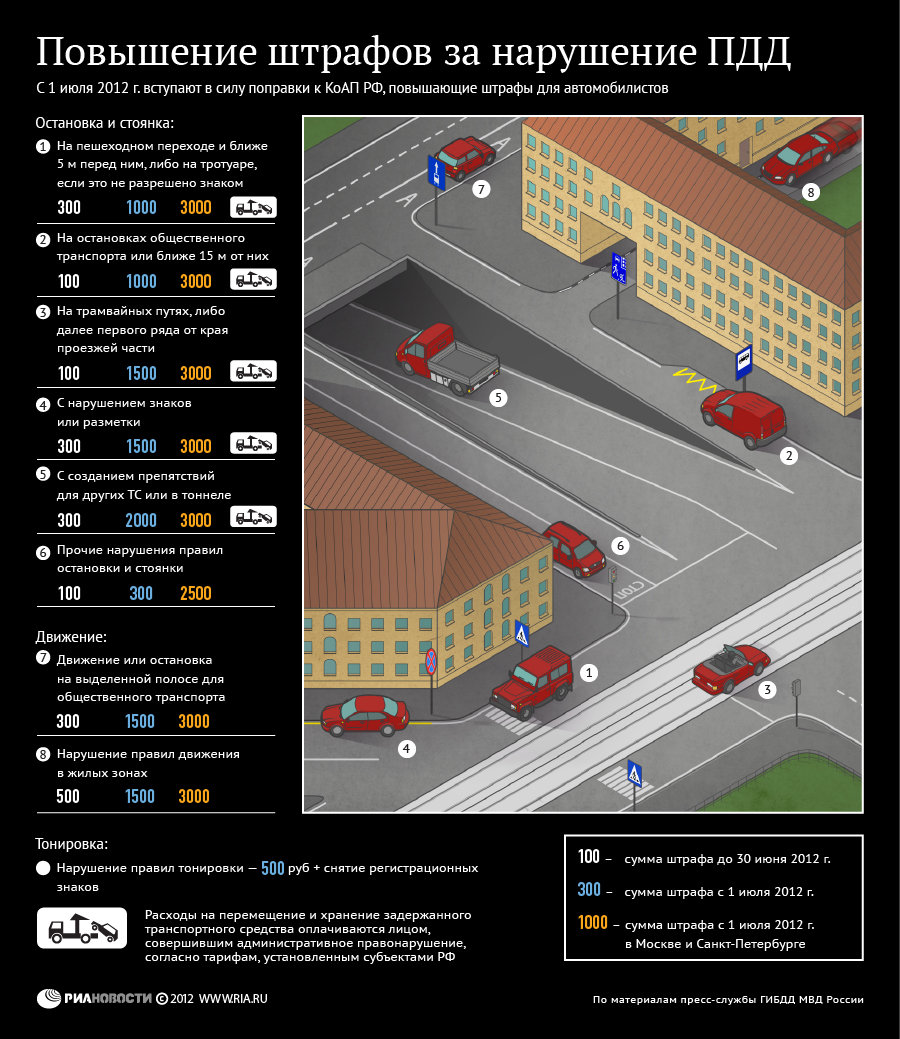 Ну вот, 1 июля не за горами, осталось пару недель. Торопитесь нарушать по дешёвке а то будет дороже! Нарушение - Прежний штраф - Новый штраф - Новый штраф для Москвы и Санкт-Петербурга, руб. Проезд на запрещающий сигнал светофора 700 1000 1000 Наезд на стоп-линию при остановке на перекрестке 100 800 800 Выезд на перекресток, за которым образовался затор 100 1000 1000 Невыполнение требования ПДД уступить дорогу на перекрестке 100-200 1000 1000 Движение или остановка на полосе, предназначенной для маршрутных транспортных средств 100 1500 3000 Нарушение правил остановки и стоянки 100 300 2500 Несоблюдение знаков и разметки, запрещающих остановку и стоянку 100 1500 3000 Остановка и стоянка на переходе либо нарушение правил остановки и стоянки на тротуаре 300 1000 3000 Остановка и стоянка на остановках маршрутных транспортных средств (кроме вынужденной и посадки-высадки пассажиров) 100 1000 3000 Остановка и стоянка на трамвайных путях либо далее первого ряда от края проезжей части 100 1000 3000 Нарушение правил остановки и стоянки, повлекшее создание препятствий для движения других транспортных средств, остановка и стоянка в тоннеле Предупреждение или 300 2000 3000 Нарушение правил движения в жилых зонах 500 1500 3000
