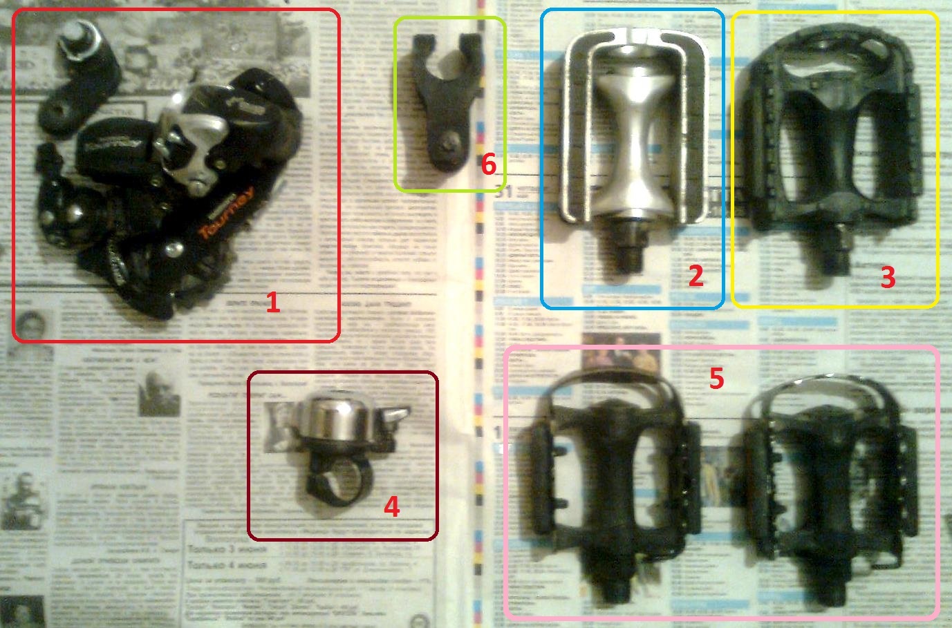 продаю все что осталось от велика 1 задний переключатель shimano tourney СЛОМАН = 50 руб 2 педаль правая алюминиевая с отражателем= 50 руб 3 педаль левая пластмассовая с отражателем = 50 руб 4 звонок = 50 руб 5 комплект педалей алюминиевых с отражателем = 150 руб 6 крепление для фонарика новое = 50 руб цена за все = 300 руб