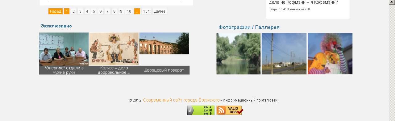 А чо, нормальный такой сайтик про все …главное в этом деле самому определиться ,что ты хочешь от сайта или так сказать в чем ево внутренняя жизня и когда это самоопределение проявится , тогда легшее жить…. Я так понял, что этот сайт про город Волжский и паблик Короче, у меня никаких отторжений нету, хотя я не спец по кнопкам всяким и движкам, а так, как пользователь, то вполне приемлемо……. Жил бы в Волжском, то сделал закладку обязательно….. Удачи создателям сайта