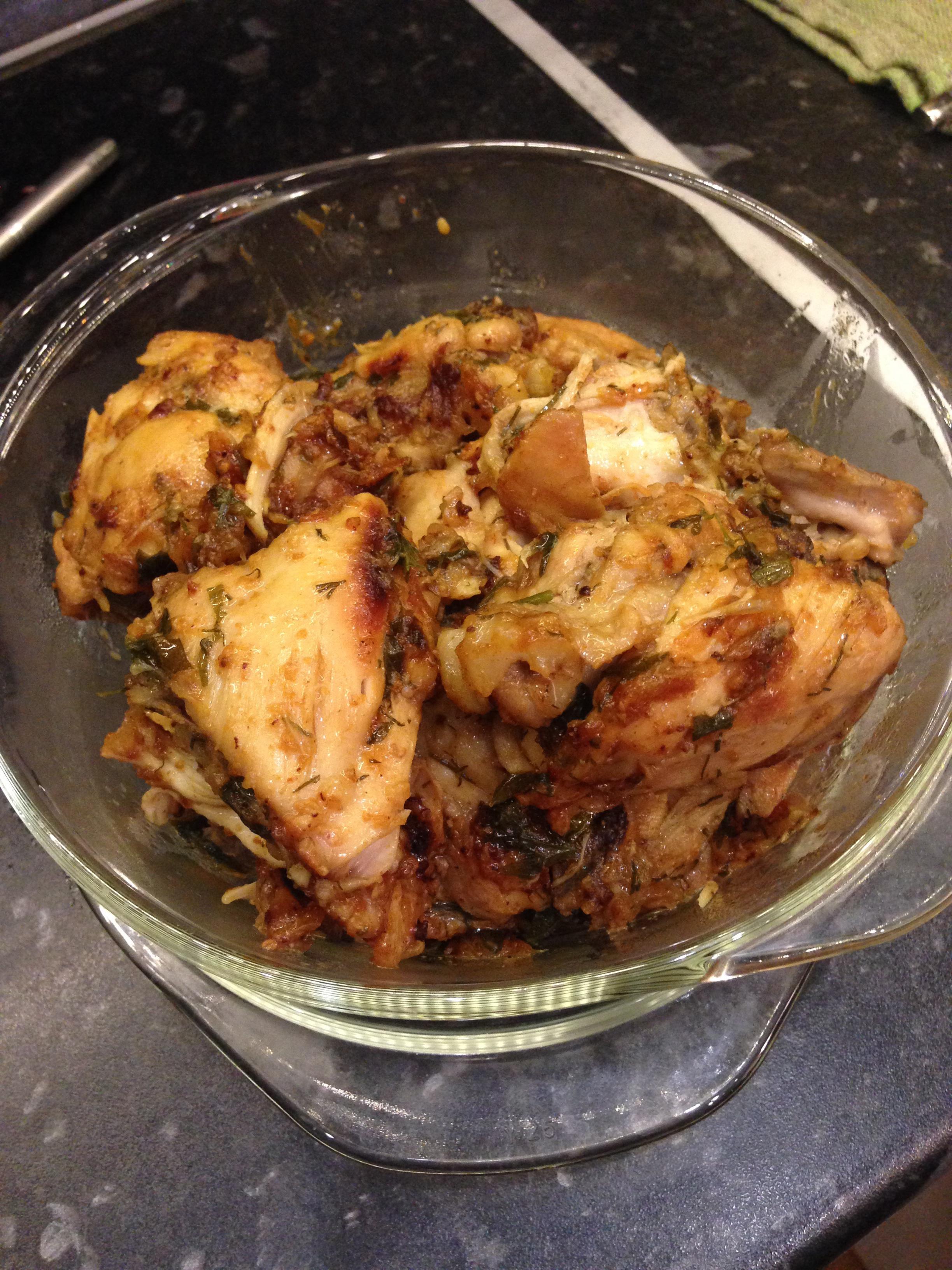 Больше года моя мультиварка простояла без действия. Пришло время пользоваться. Куриные бёдра маринованные в: лук, бальзамический уксус, чеснок. Приготовлено на режиме "Выпечка" 40 минут, в конце зелень. С солью чуть рука дрогнула) И кожуру я убрала, без неё готовила.
