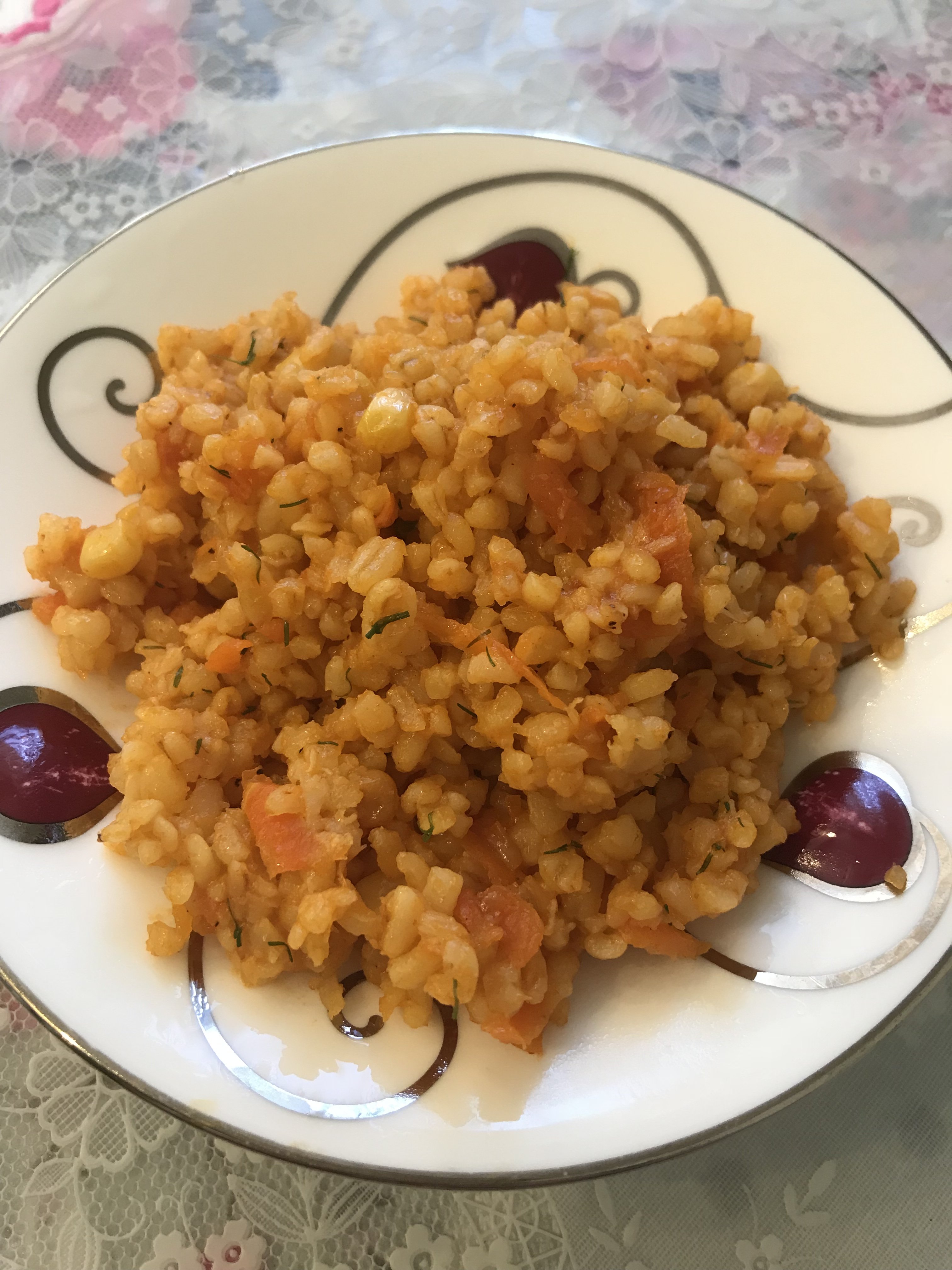 Булгур с овощами. Обжарить лук, чеснок, морковь. Добавить кукурузу, томатную пасту. Соль, перец, мускатный орех. Выбрать режим варка крупы, засыпать булгур, не мешать, залить водой, ещё посолить. Через половину времени я заглянула, воду доливала, а то изначально мало налила. Посыпать укропом, перемешать.