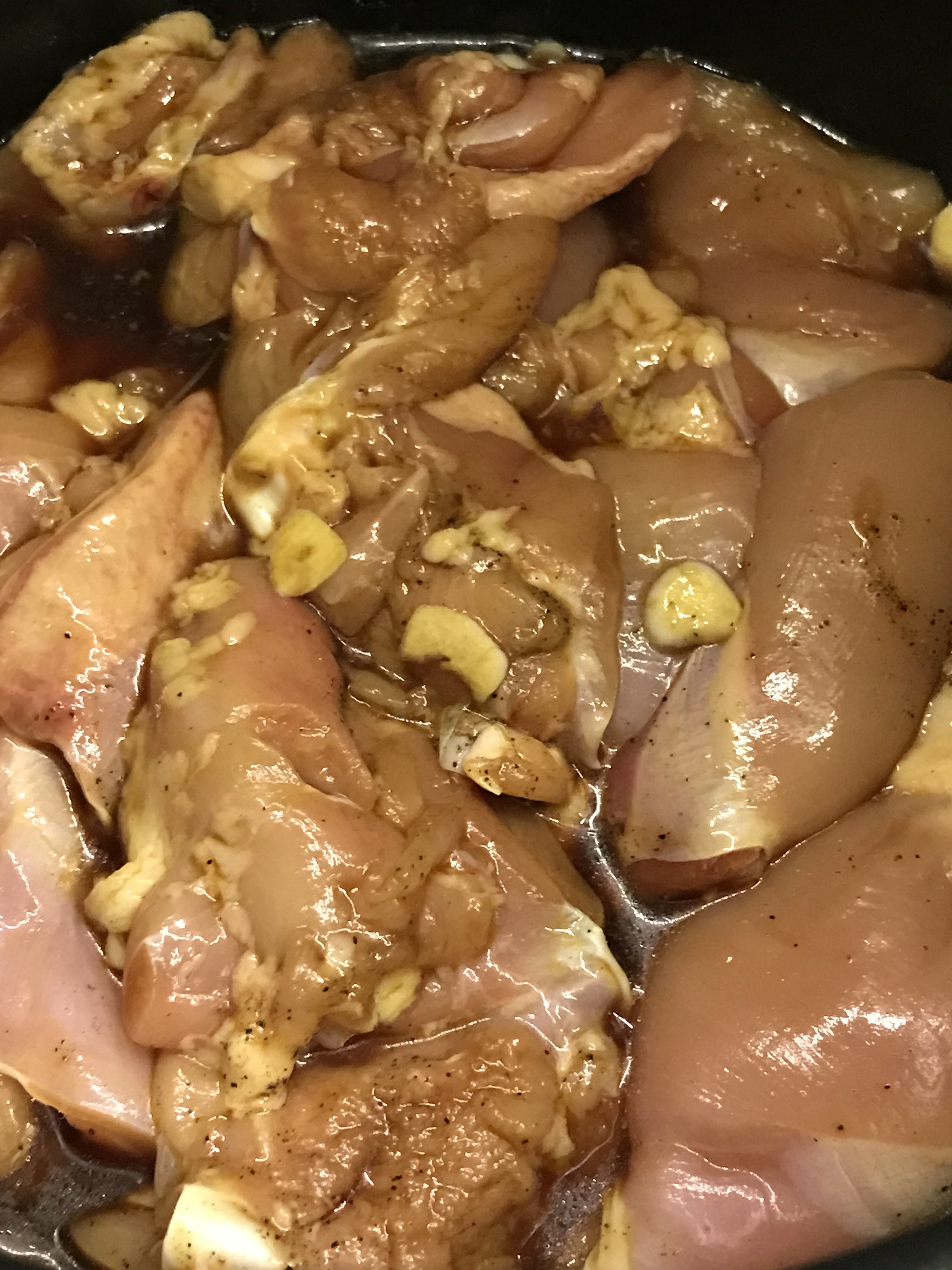 Куриное мясо бедра без кости замаринованное в соевом соусе и чеснок. Стояло не менее 30 минут. Чёрный молотый перец, немного воды и на 1 час в режиме Тушение.