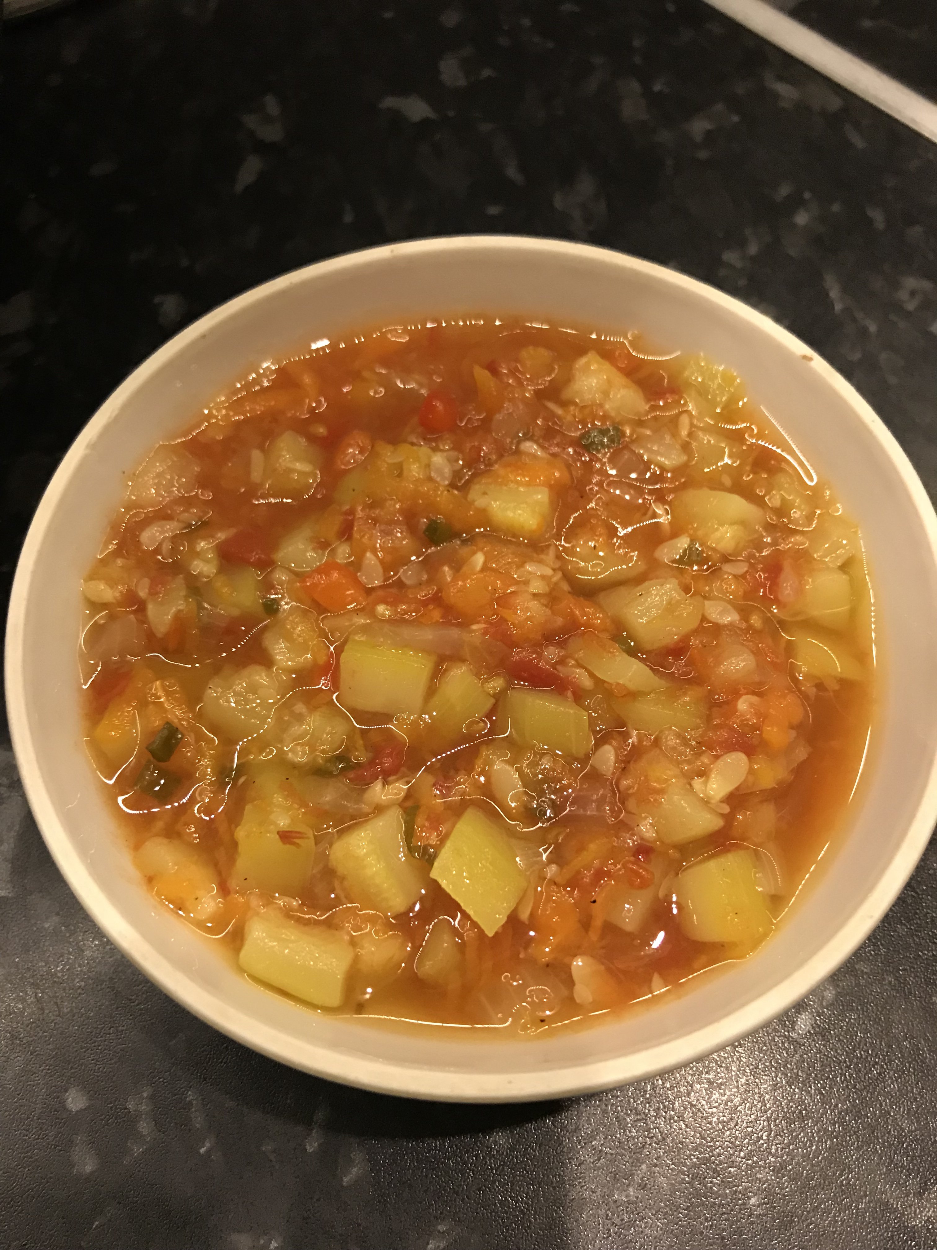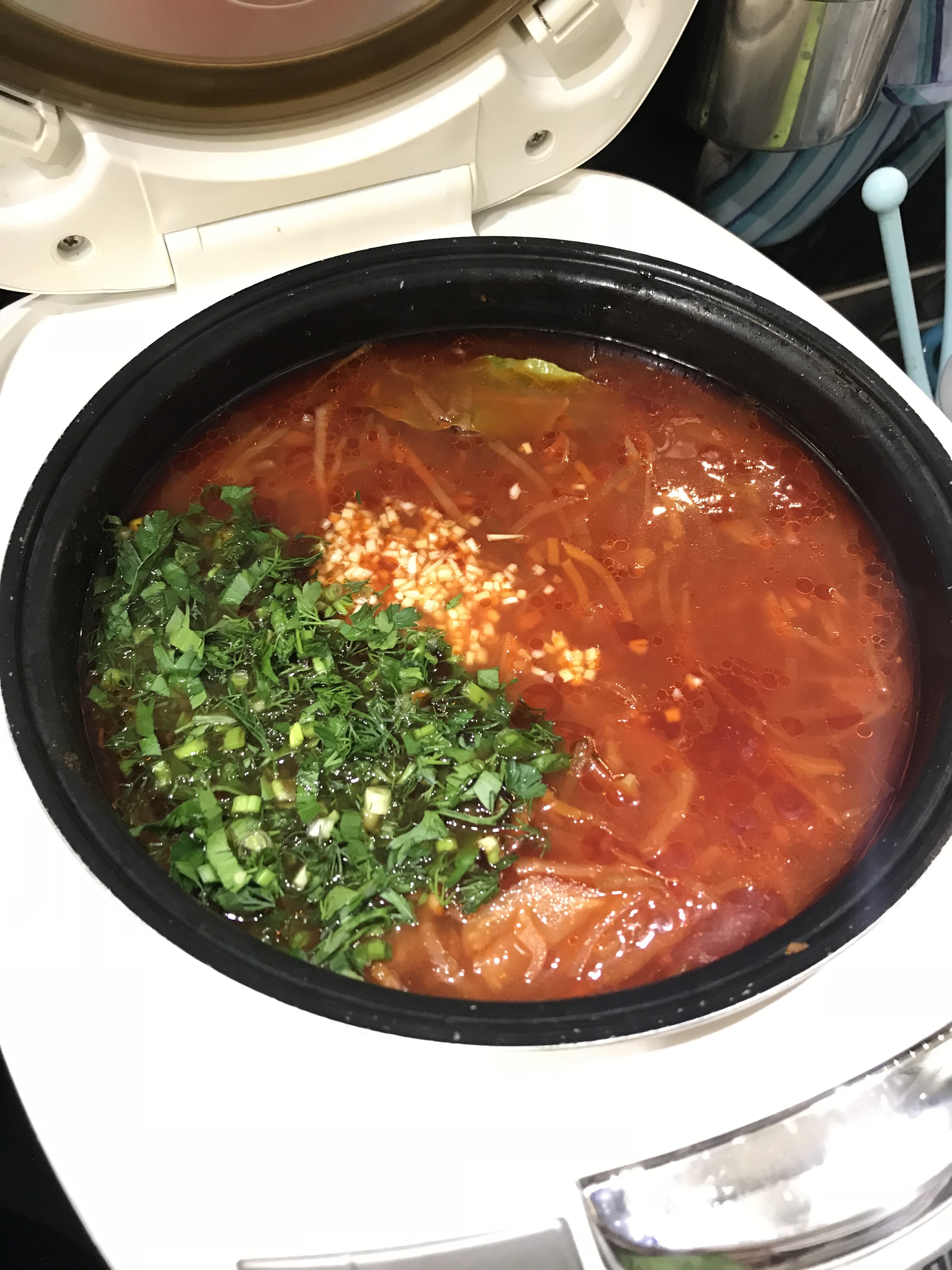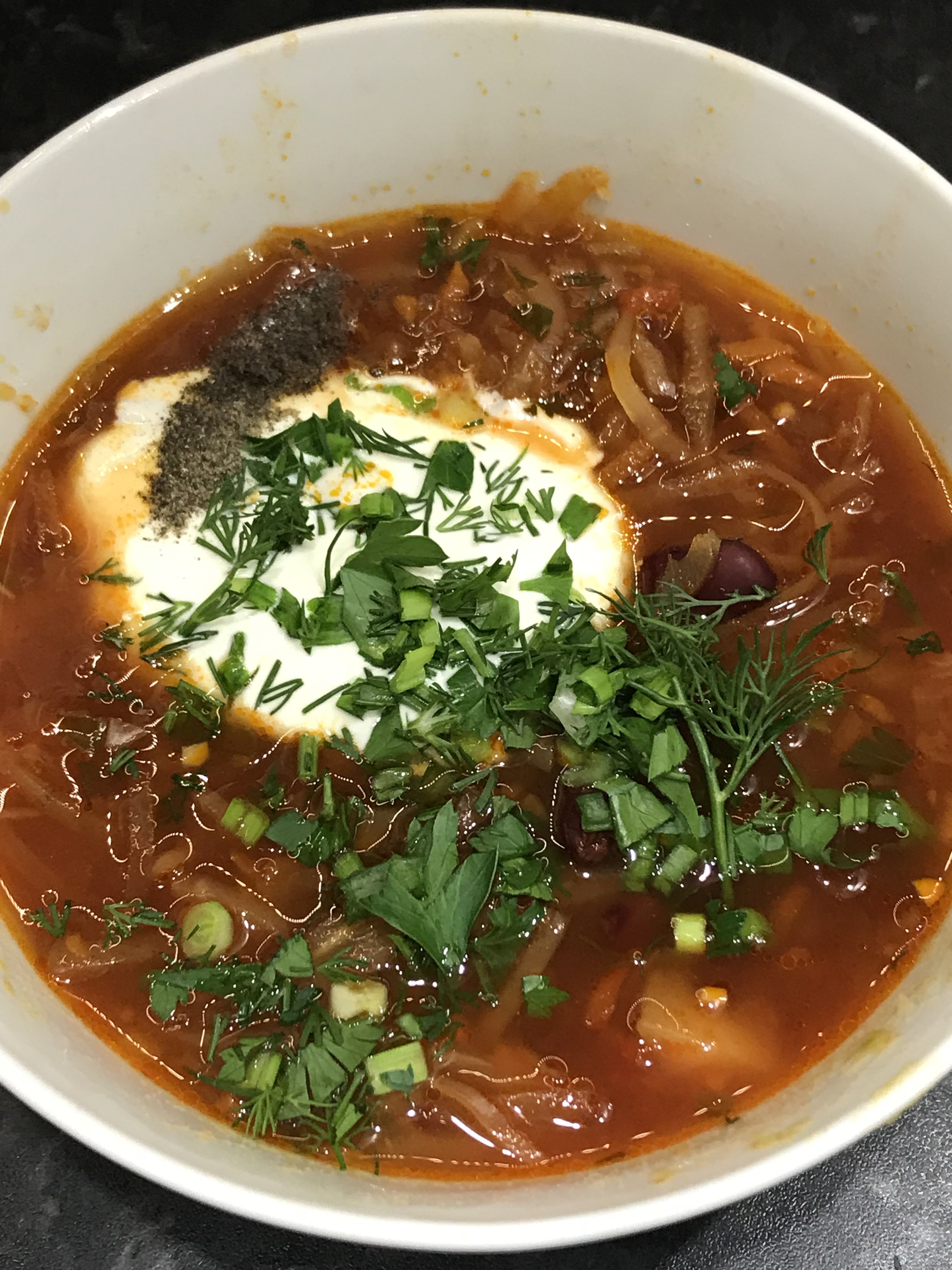 Борщ. В чашу пару столовых ложек оливкового масла, лук, морковь, красный болгарский перец и вкл режим «Жарка». Когда овощи станут мягкими и поджарятся, добавить свеклу, продолжать обжаривать. Далее добавить соль, чёрный перец горошком, мускатный орех, красную фасоль (консервированную), картофель (заранее вымачиваю в воде), капусту и включить режим «Суп» на 1ч30мин. По завершению, добавить чеснок, зелень, лавровый лист, довести по соли если необходимо и оставить настаиваться. Получается вполне съедобный овощной суп))) Ой, после капусты, налить воду))