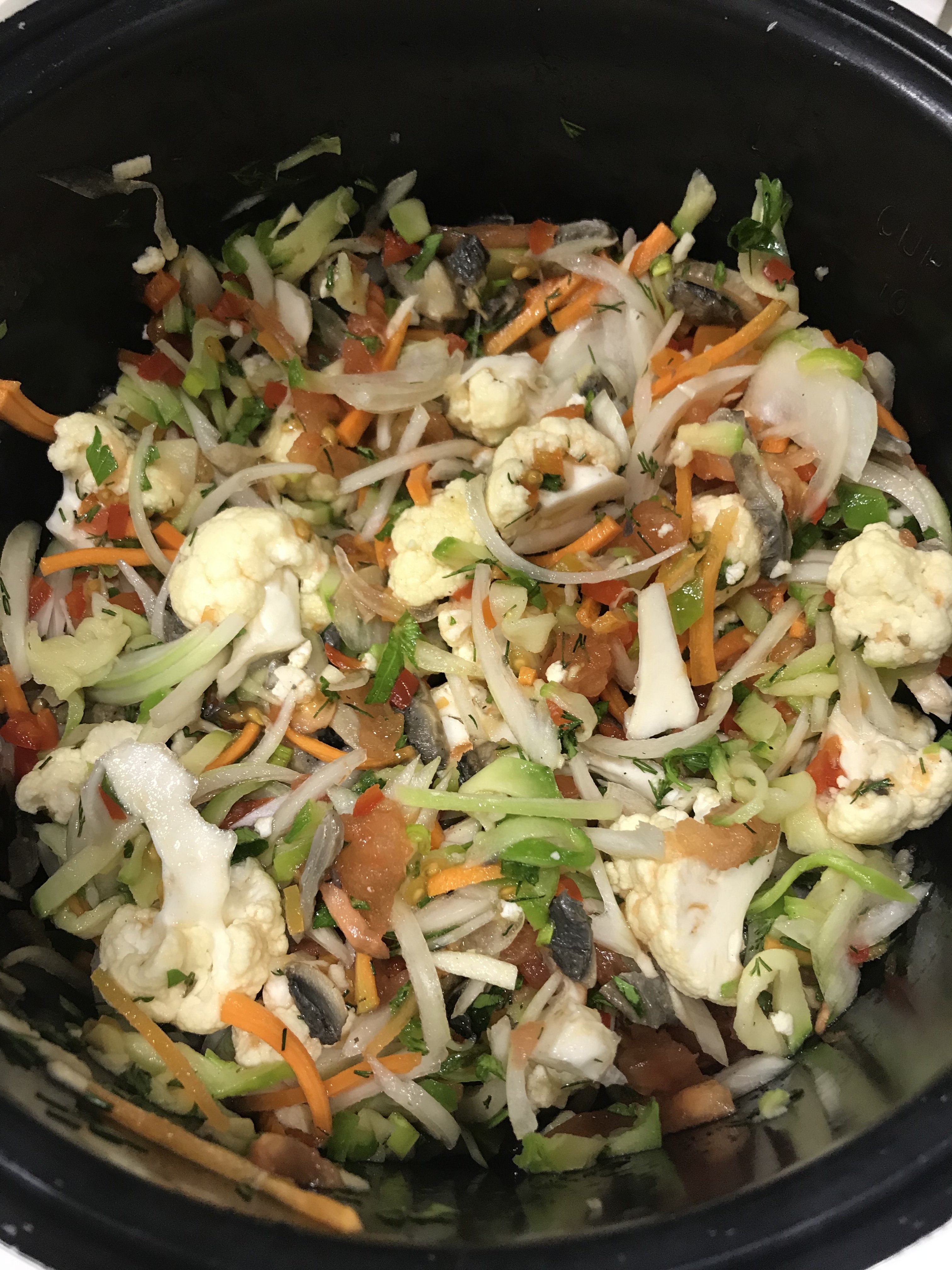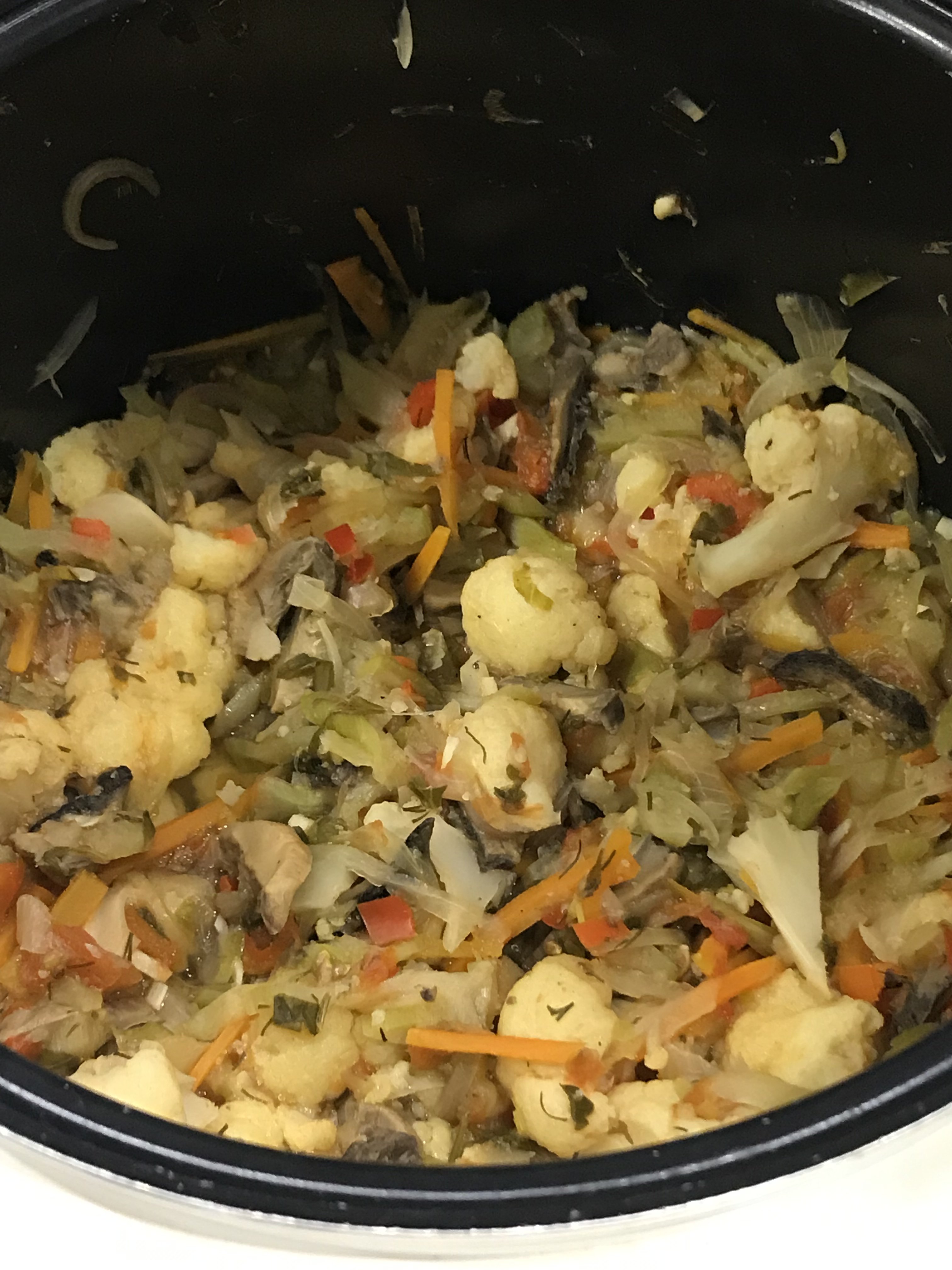 Овощное рагу - чеснок - цветная капуста - кабачки - морковь - лук репчатый - болгарский перец красный - шампиньоны - укроп, петрушка, лук перья - соль, чёрный молотый перец, мускатный орех - вода Режим Тушение овощей на 50 минут. Поставила на 30, но за это время не доготовилось, добавила ещё 20мин.