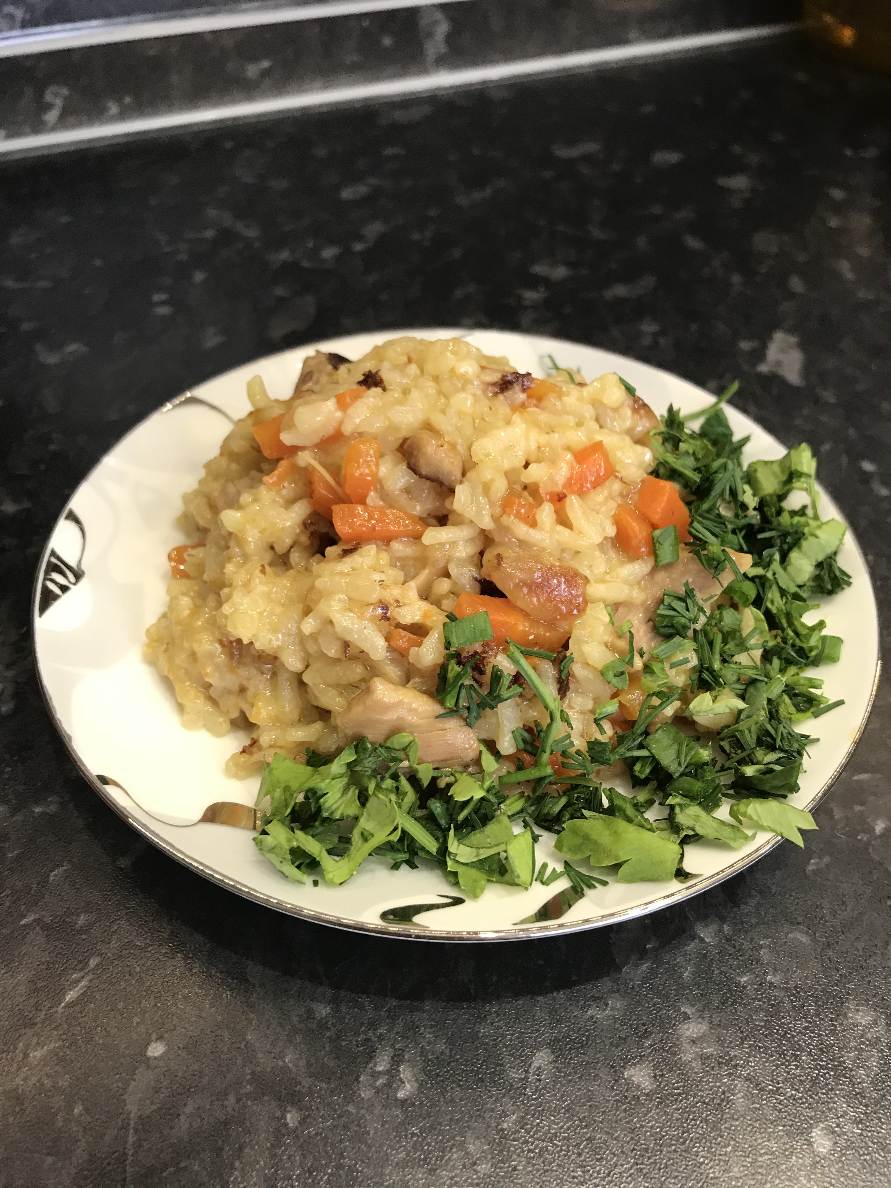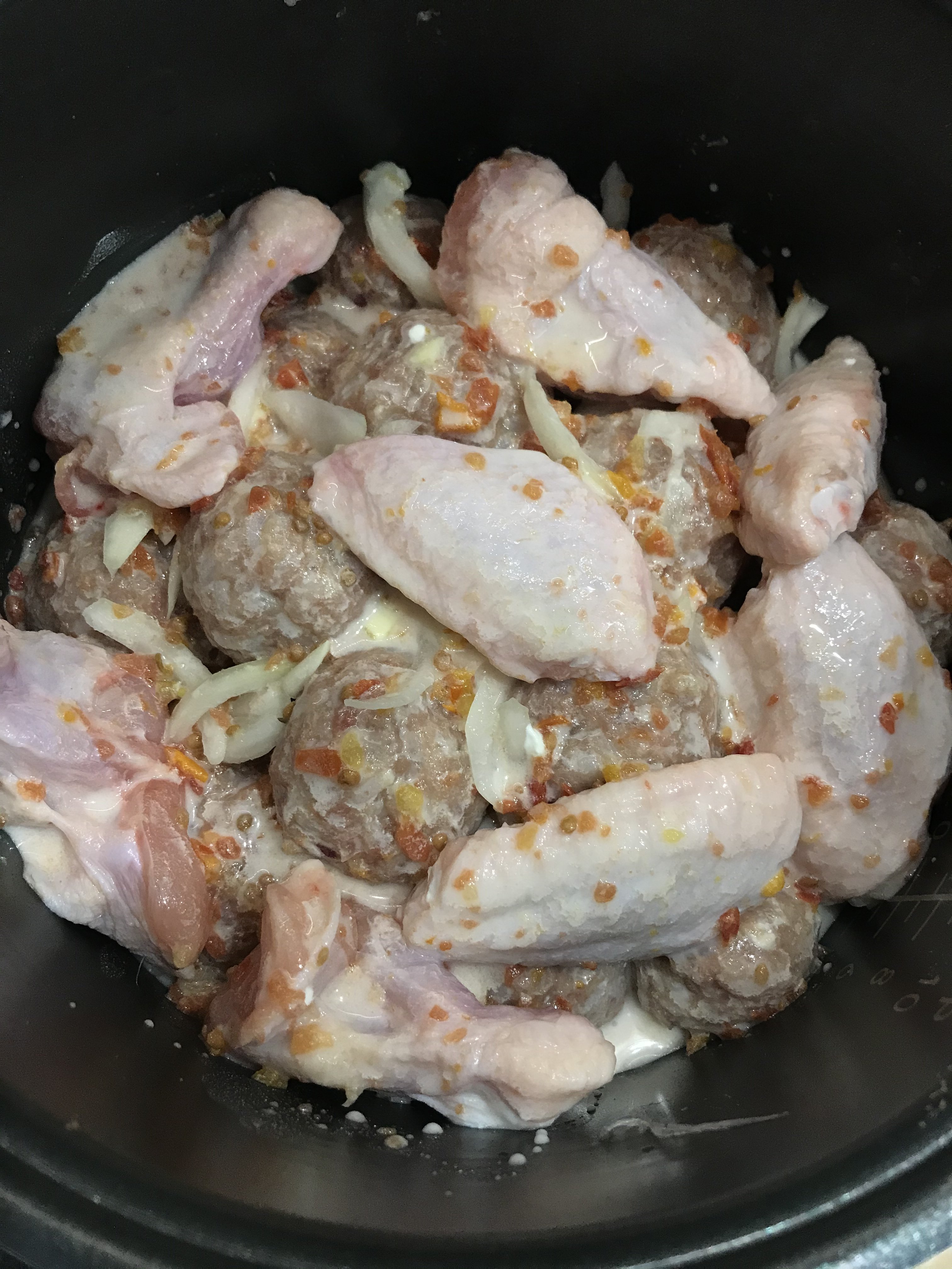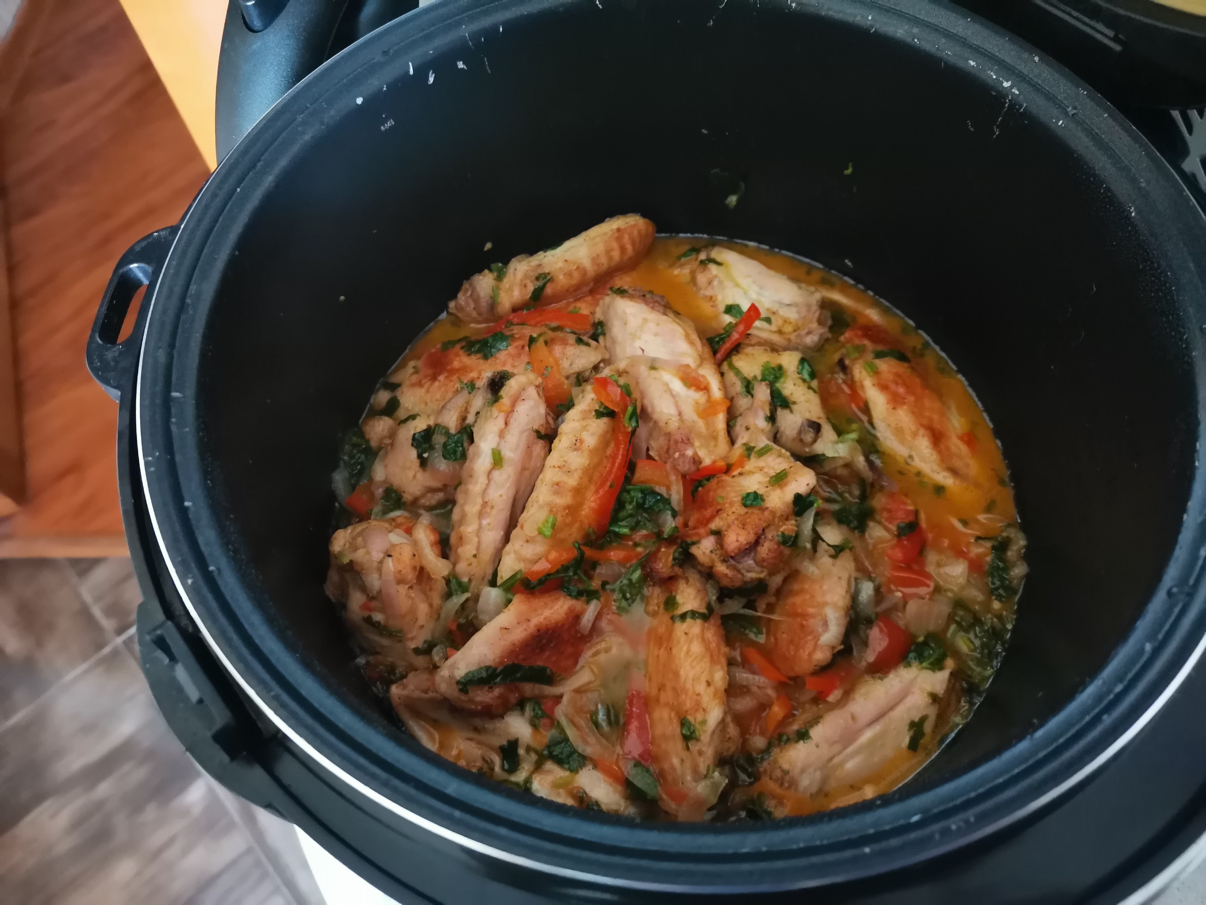 Готовила чахохбили. Для этого берутся любые части курицы, у меня крылья. Замариновала их, приправила и отправила в духовку запекаться. Берём много лука, головок 5-6. Режем дольками 1/4. Жарим на сливочном масле в мультиварке лук. Нарезаем полосками болгарский красный перец (лучше красный, он слаще других), отправляем к луку. Нарезаем 1 крупный помидор или у меня были средние, у меня 4 ушло. Теперь всё солим. Достаём запечённые и подрумянившиеся крылья и смешиваем с овощами, сок от курицы туда же. Перемешиваем. Режем много кинзы, даже если кинзу не любите, в этом блюде её лучше не заменять. Я кушаю прям так, а кому хочется плотнее, тогда можно с гарниром. У меня вот вчерашняя перловка в ход пошла))