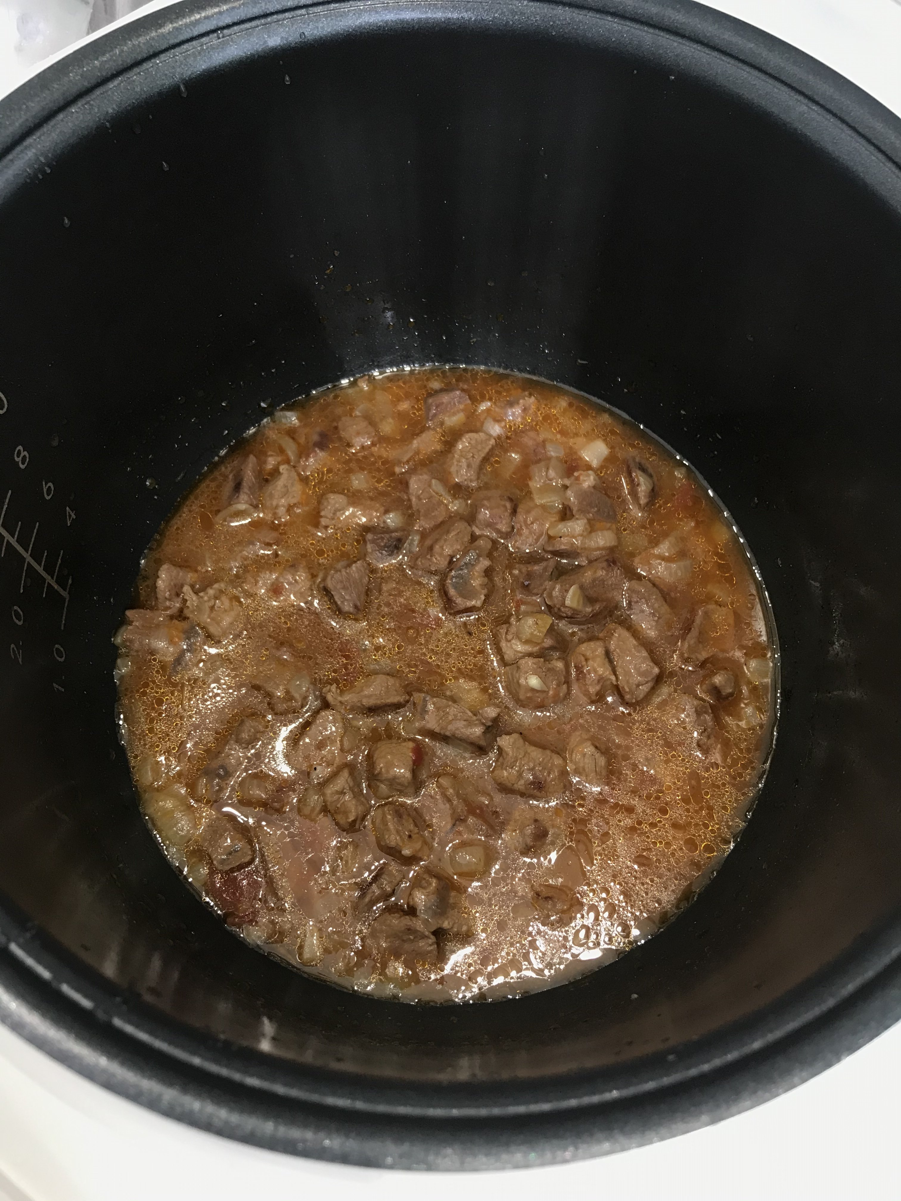 Гуляш из телятины Обжарила мясо, добавила лук, обжарила. Соль, перец, мукой посыпала, чуть обжарила. Добавила томаты в собственном соку, воды и режим Тушение. На гарнир есть пюре, макароны.