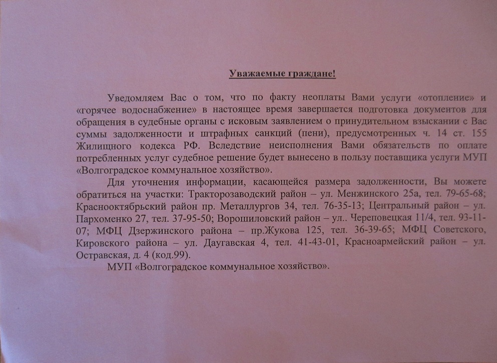 Skywarrior, Нормально так. Ваша УК ворует ваши деньги. Не перечисляет в МУП. А виноват МУП! 5 баллов! По моему 3я фотка красноречива, да получатель на 1й тоже. Ну если вы все платили, то что дергаться? Покажите приставам платежки и все! А вторая фотка - фальшивой угрозы от МУПа. МУП не занимается физическими лицами! У него нет такой возможности! Единственное исключение - индивидуальный теплосчетчик у вас. МУП должен подавать в суд на УК. Кстати адрес МУПа Центрального района - фальшивый. Пархоменко 47 должно быть, а не 27.