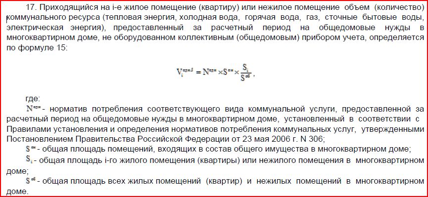 Рассмешили…. итак, грубый расчет для понимания….. Чего такое S(об) – это сумма площадей жилых и нежилых (или как их еще называют встроенные)…. Для чистоты эксперимента пусть у нас в доме нет никаких магазинов, почт, офисов, кладовок, т.е. нежилых встроенных помещений, на которые есть самостоятельное право собственности у кого-то… Пусть у нас в доме только общедомовое имущество (общедомовые площади) и жилые помещения (жилые площади)….. Далее, есть такой чисто эмпирически выведенный коэффициент 0,18 м2 площади общедомой на 1 м2 площади жилой…. Тогда если провести простейшие манипуляции с формулой мы приведем ее к следующему виду: Объем за ОДН с квартиры = норматив на ОДН х 0,18 х площадь квартиры В итоге мы получаем, что ваше предположение о «…выйдет как раз Ваша жилая площадь + еще немного…» отличается от правильного примерно в 5,6 раза, причем в большую сторону…..