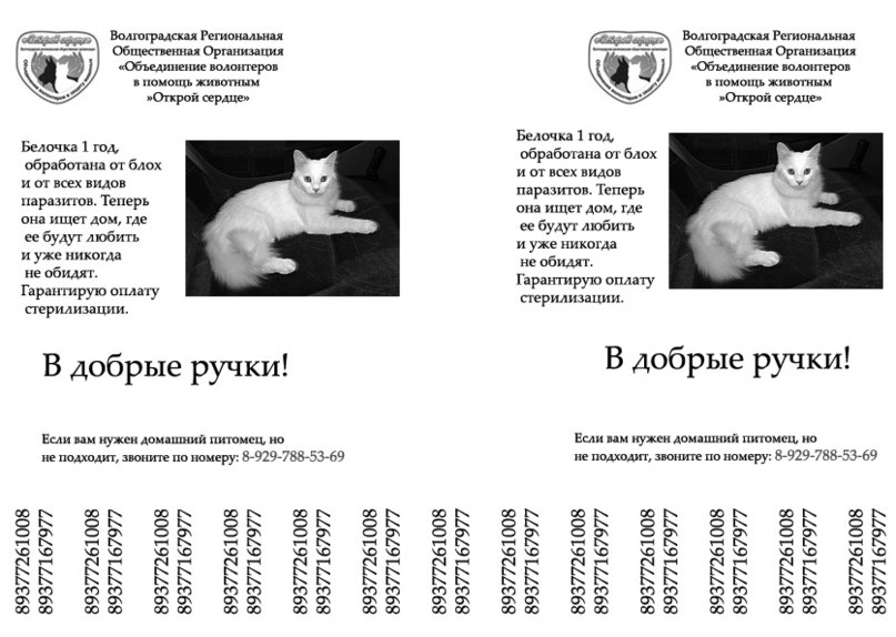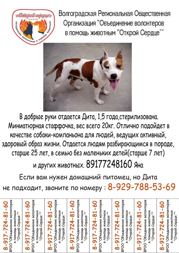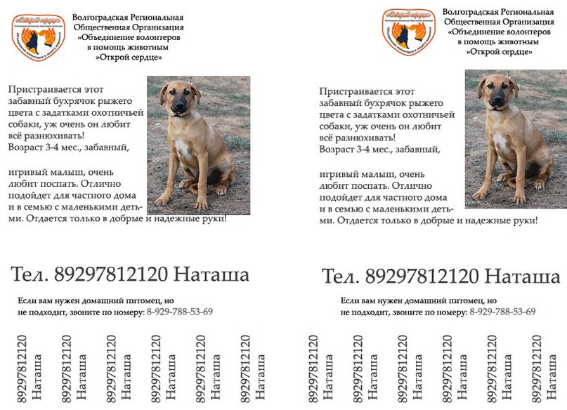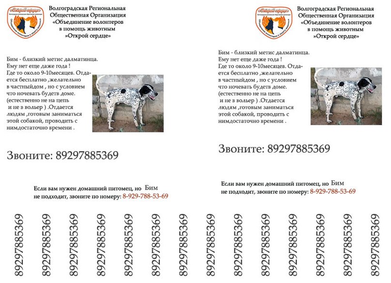 Елена Беспристрастная, вертикальные полосы между номерами телефонов - ну не нужны они) и, вместо названия организации - лучше написать - собака в добрые руки или что-то типа того)).