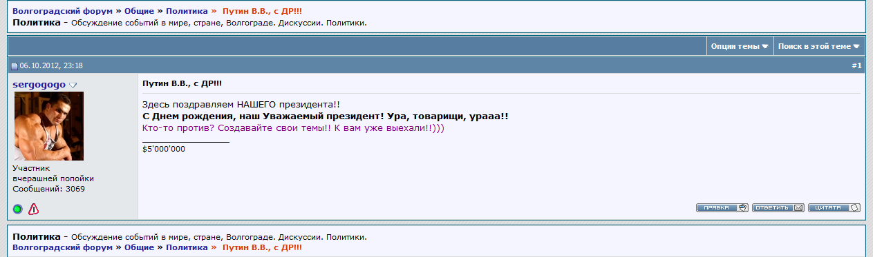 Здесь поздравляем НАШЕГО президента!! С Днем рождения, наш Уважаемый президент! Ура, товарищи, урааа!! Кто-то против? Создавайте свои темы!! К вам уже выехали!!))) заскриншотил - на всякий...)))