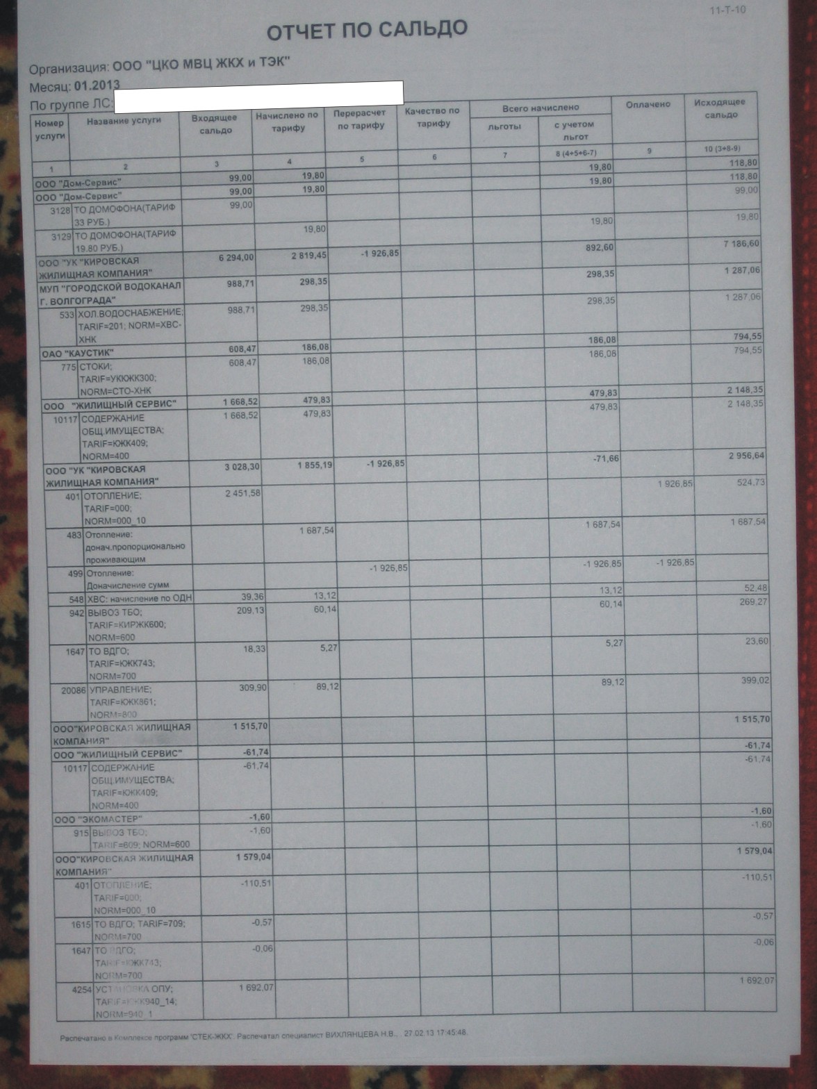 ОЧЕНЬ ПРОШУ КОНСУЛЬТАЦИИ: Добрался до сальдовых отчетов управляющей компании по своей квартире, выкладываю для консультации 2 страницы: 1. отчет по сальдо форма 11-Т-10 2. миниотчет по сальдо. Строки ООО "Кировская жилищная компания" - 1515,7 руб. встречаются на 2-х страницах, но сумма 1515,7 руб. одна и таже, предполагаю, что это один и тот же долг, но только два раза показан для разных нужд. Вопрос 1: сколько я должен в ООО "Кировская жилищная компания", а сколько в ООО "УК Кировская жилищная компания" ? Мои версии, что: - в ООО "КЖК" - 1515,7 руб. - в ООО "УК КЖК" - 7186,6 руб. ИТОГО: 8821,1 руб., что собственно на второй страницы и показано. Так ??? Вопрос 2: нам по отоплению делали перерасчет 2 месяца - 846 руб. и 1926 руб. Так вот 1926 в Сальдо отражен, а 846 нет. Почему ? Или может 846 руб., это не перерасчет по отоплению, а какие-то другие деньги ?