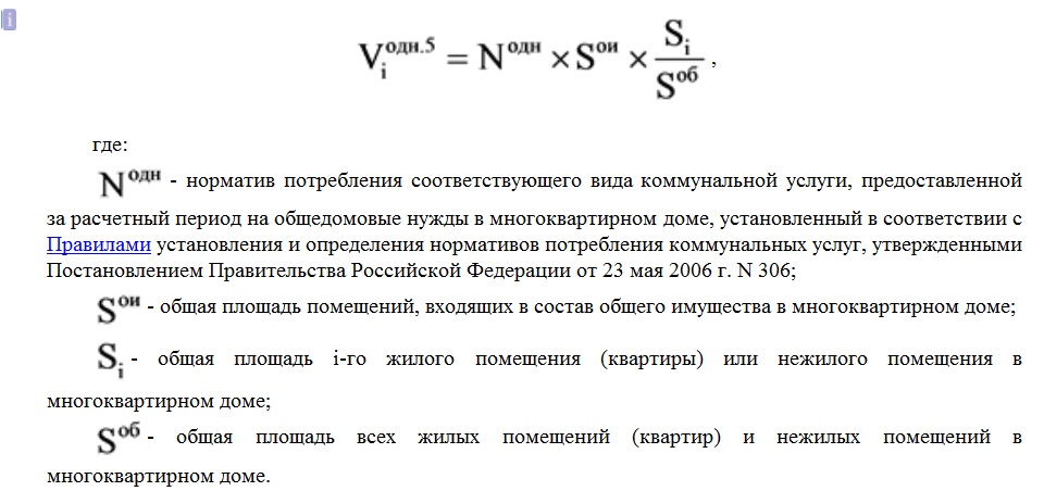 Если есть общедомовой электросчётчик, то обязаны рассчитывать по счётчику и никакой коэффициент 2,6 не применяется. Но, как показывает опыт здешних форумчан, это не всегда выгодно, так как уровень воровства соседей неимоверен. Расчёт при отсутствии общедомового электросчётчика должен быть приведён в Вашей платёжке, по следующей формуле: где Nодн - волгоградский норматив равный 2,6кВт В платёжке это выглядит, к примеру, так: Vодн = (2,6*1000 [это площадь общего имущества])*50[это площадь вашей квартиры] / 4000 [это площадь всего дома]