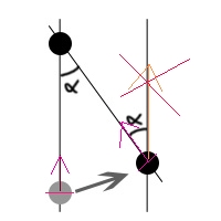 Вы не правы. Наблюдатель, находящийся на нижней точке при вращении нижней точки вокруг верхней будет смотреть в том направлении, в котором показывют малиновые стрелки, но никак не туда куда указывает оранжевая, иначе он ещё дополнительно должен проворачиваться вокург своей оси, как бы отворачиваясь в строну. Если признать нижнюю точку неподвижной, то верхняя точка просто будет вращаться вокруг своей оси. Для наблюдателя в нижней точке верхняя точка будет совершает поворот на угол "альфа", только если этот наблюдатель находясь на неподвижной нижней точке вдруг сам начнёт вращаться вокруг своей оси. В этом случае верхняя точка действительно будет находится, то спереди от него, то сбоку, то сзади.