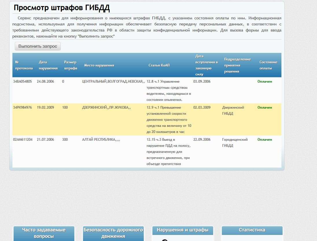 А что за сайт? Я бы тож глянул про себя... ---------- Сообщение добавлено 19.11.2012 10:20 ---------- http://34.gibdd.ru/unpaid_fines упс, нашел. Но у меня не выдалась табличка с оплаченными штрафами. Только "По указанным реквизитам неоплаченных штрафов не обнаружено."