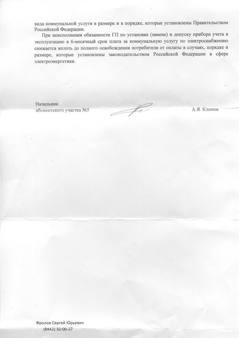 ))) Подал заявку на замену электросчетчика в связи с наступлением срока поверки, согласно нового закону)), в ответ прислали заказное письмо. Не могу не поделиться прекрасным)) Есть втут знающий человек, который мог бы мне вкратце растолковать, правильно ли я понял смысл данного послания: по закону можем поменять/или не поменять прибор учета в течение полугода, но платить будете пока по нормативам (!) (непонятно с какого перепуга, если по закону, при неподаче данных учета, должны насчитывать в течении трех месяцев по среднему за последние полгода и только затем - по нормативам, или я не прав?), а вот потом - суп с котом, их дальнейшие действия - тайна, покрытая мраком))) И к чему они обязанность по оснащению помещений приборами учета используемой воды приплели? И что мне теперь делать, распломбировать и менять счетчик самому или ждать с моря погоды? Накидайте вумных мыслей, плиз ...