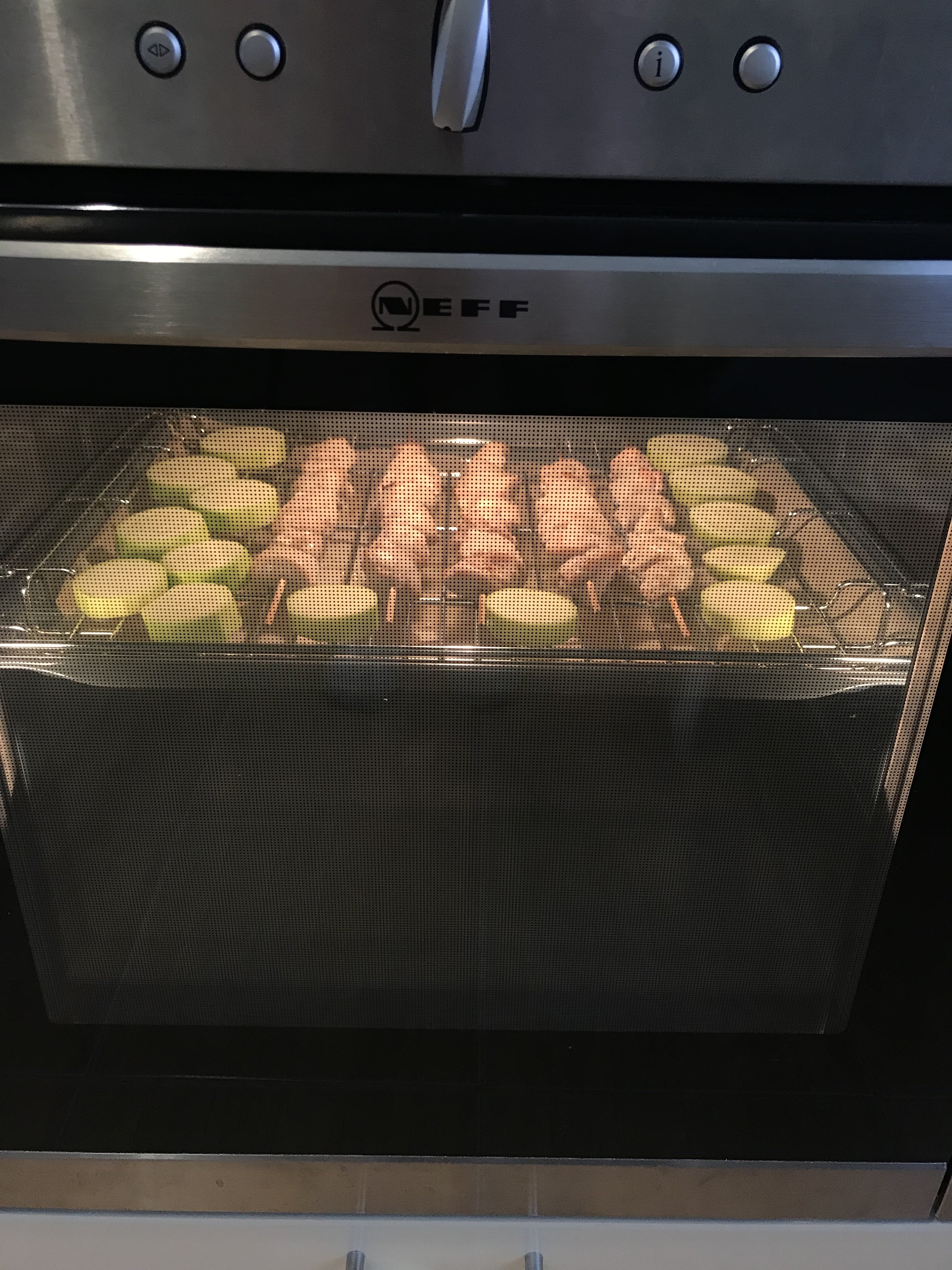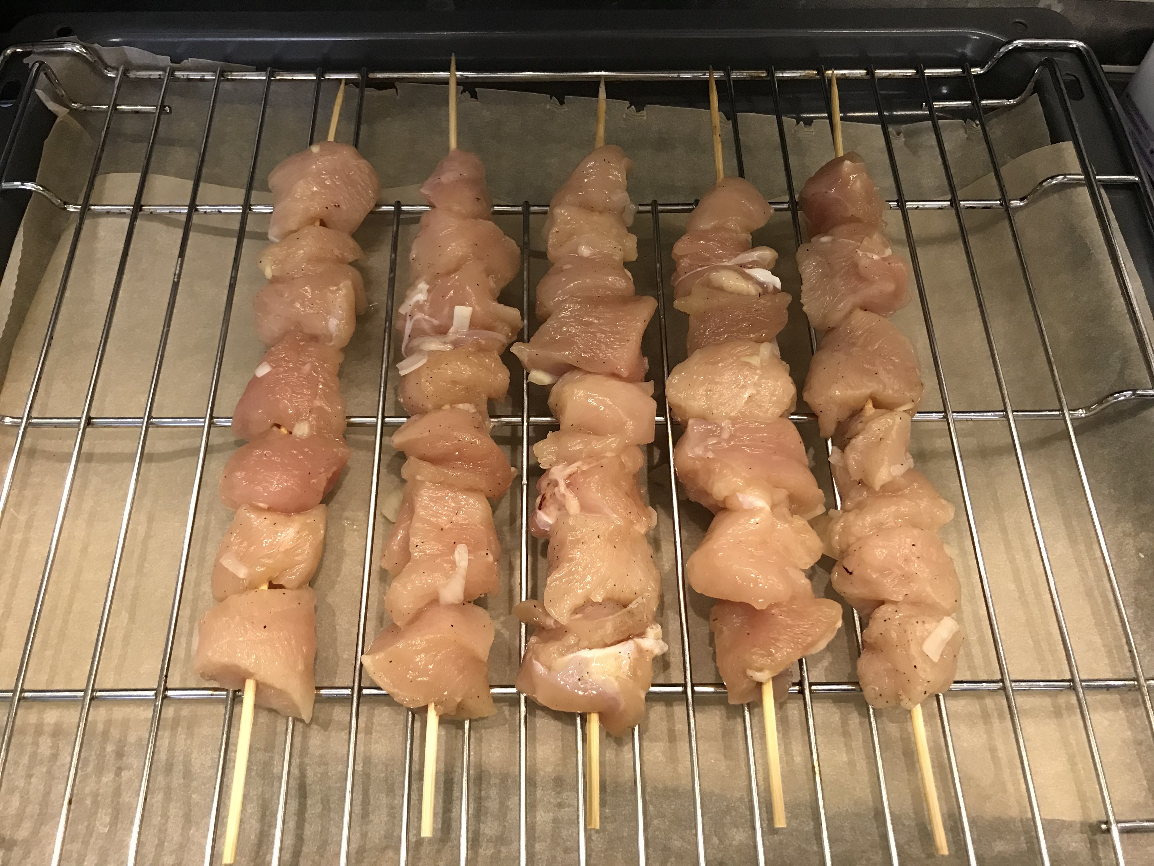 Шашлык. Филе куриное замариновала 1:1 с луком, перец. Солила перед нанизыванием на шпажки. Готовила на режиме Большой гриль (220С), шпажки один раз перевернула.