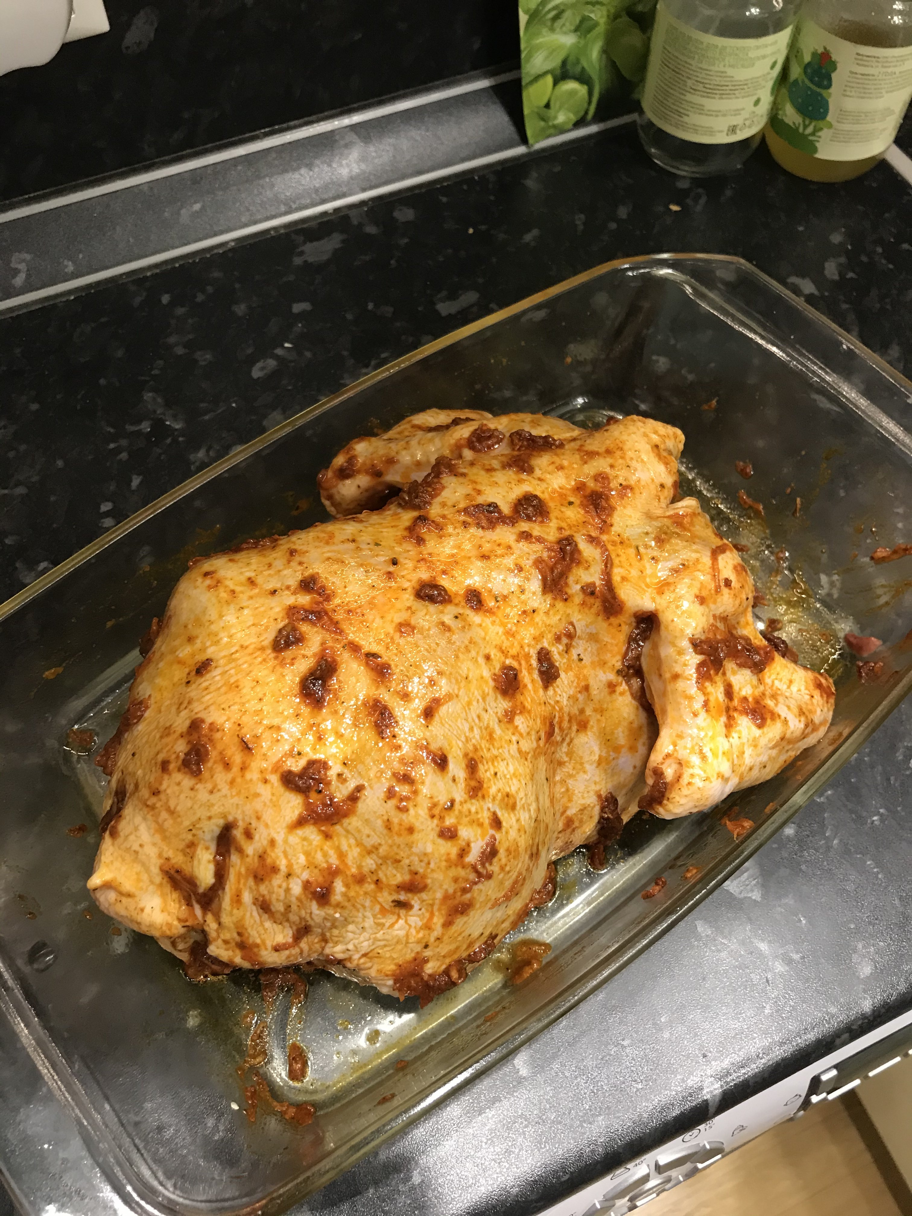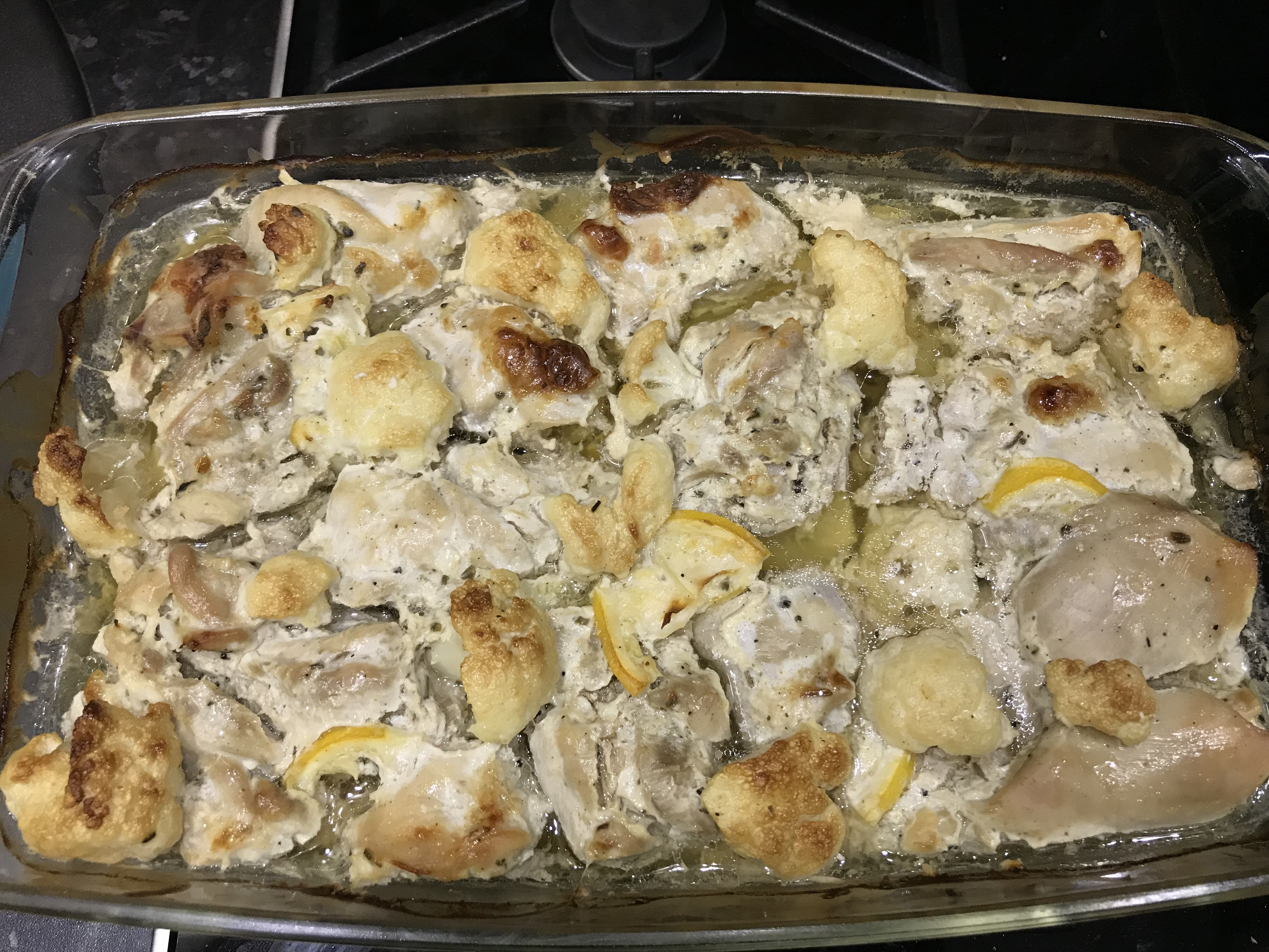 Мясо куриного бедра, без кости. Маринад: сметана, чеснок, соль, чёрный перец, лимон, базилик сушеный. Замариновала и убрала в холодильник, почти сутки получились. На низ выложила кабачок кружками, мешался в холодильнике), сверху навтыкала цветную капусту, осталось соцветие не поместившееся в пароварку-блендер)) В духовку на 180С, готовность по внешнему виду.