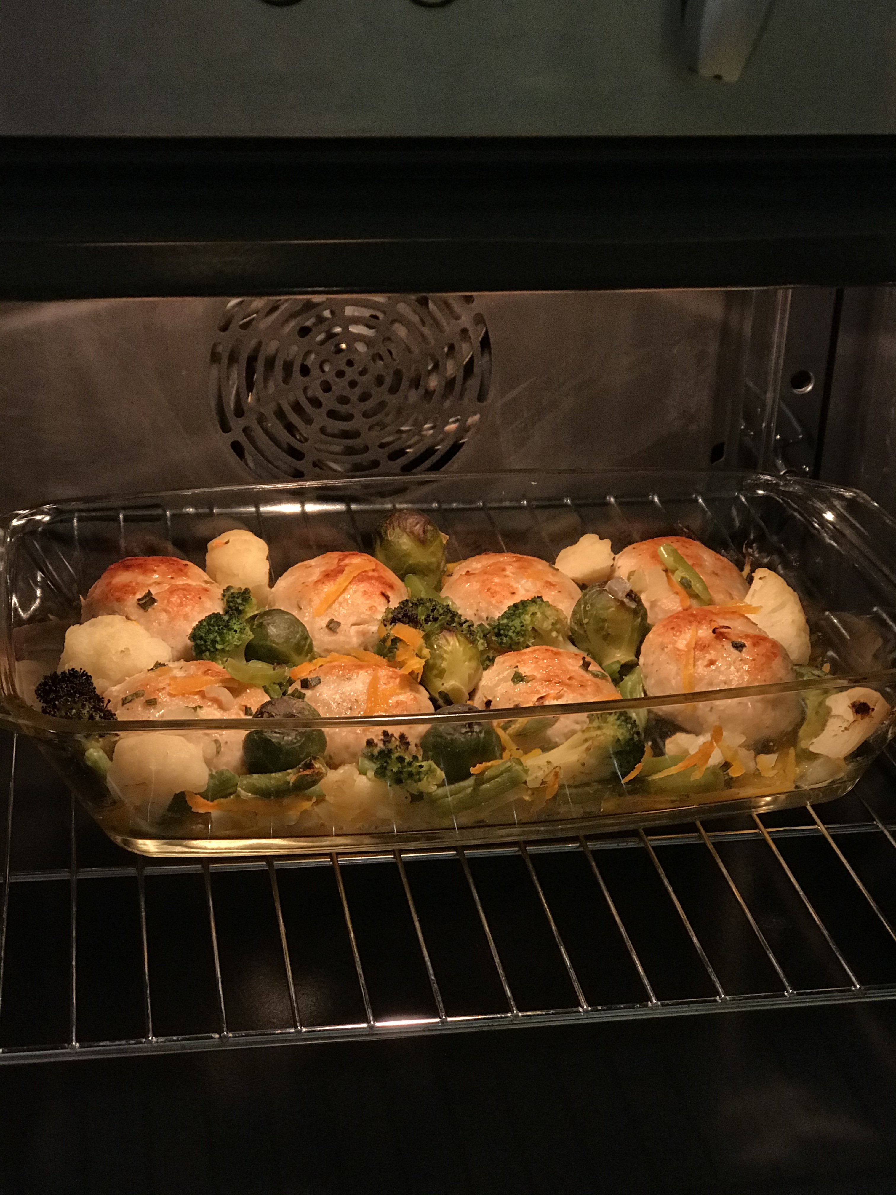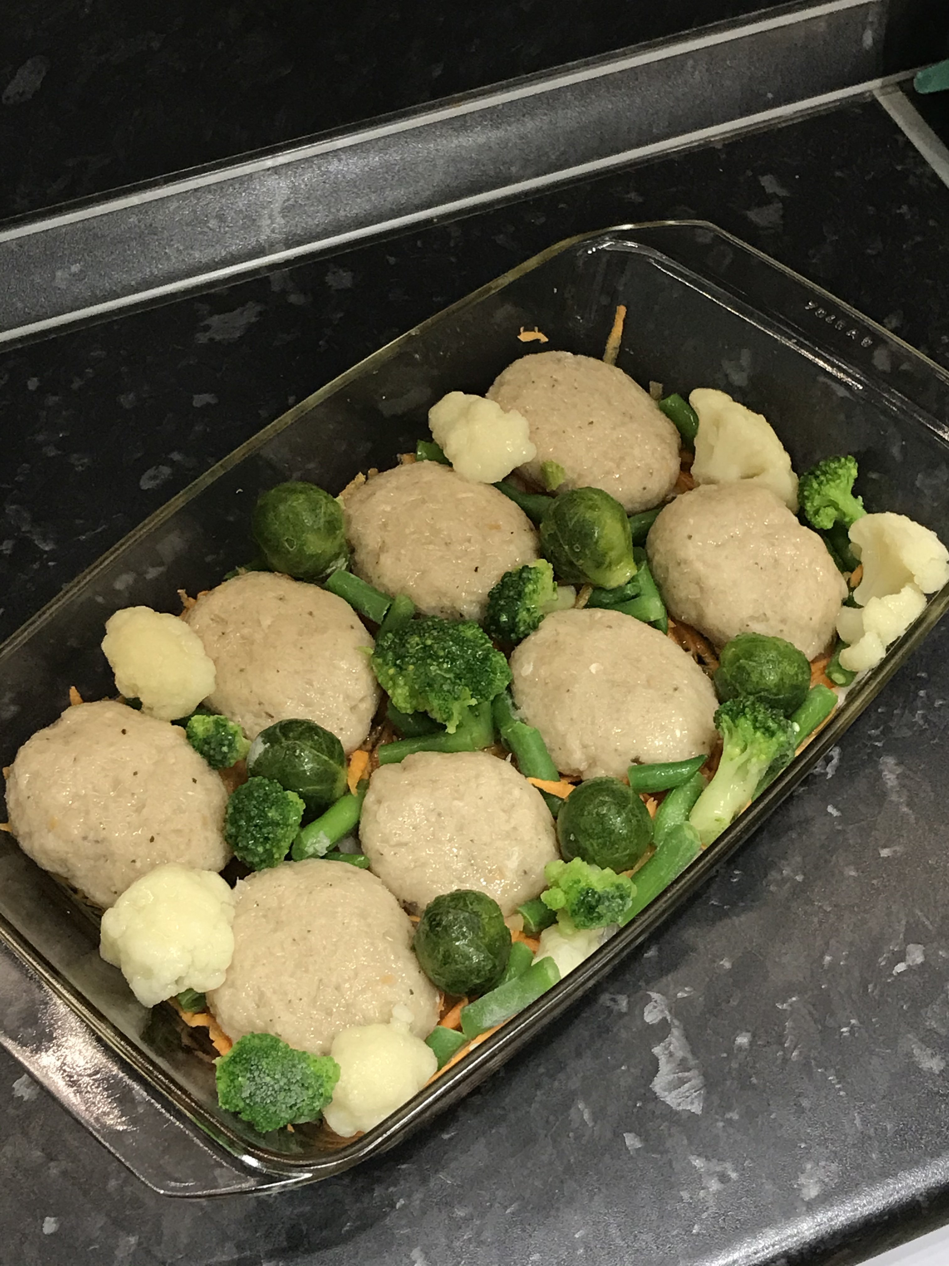 Котлеты из филе индейки. Состав: грудка индейки, лук репчатый, чеснок, батон в молоке, соль, чёрный молотый перец, мускатный орех. Перекрутила всё два раза. Подушка репчатый лук плюс морковь. Овощи что было а морозилке: броколли, цветная, брюссельская, фасоль зелёная стручковая