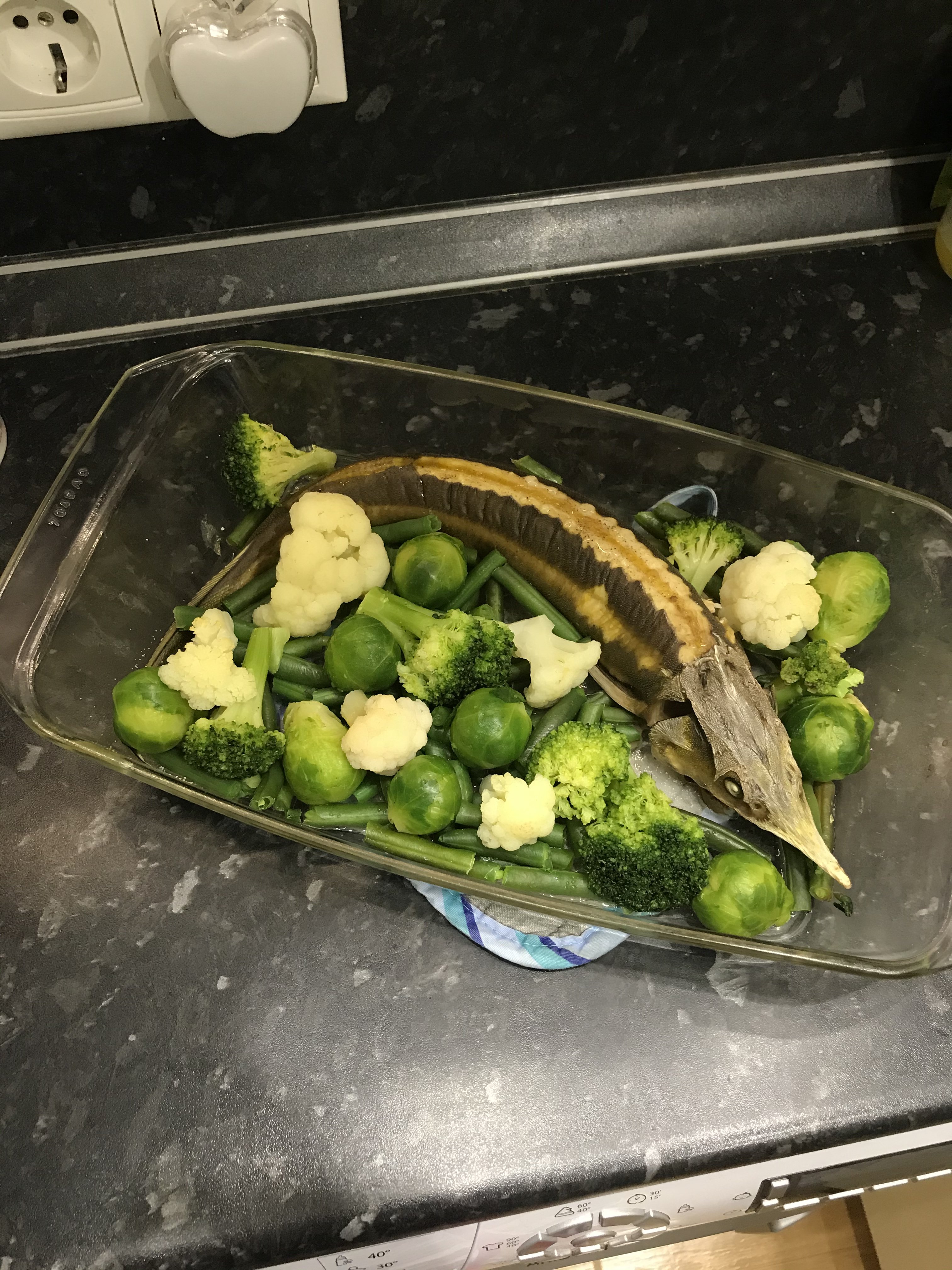 Стерлядка Помыла, убрала визягу и жучки везде, натерла солью, чёрным перцем, оставила на некоторое время. Добавила овощей и отправила в духовку на 135С и 40 минут. Перед тем как съесть, полила лимонным соком.