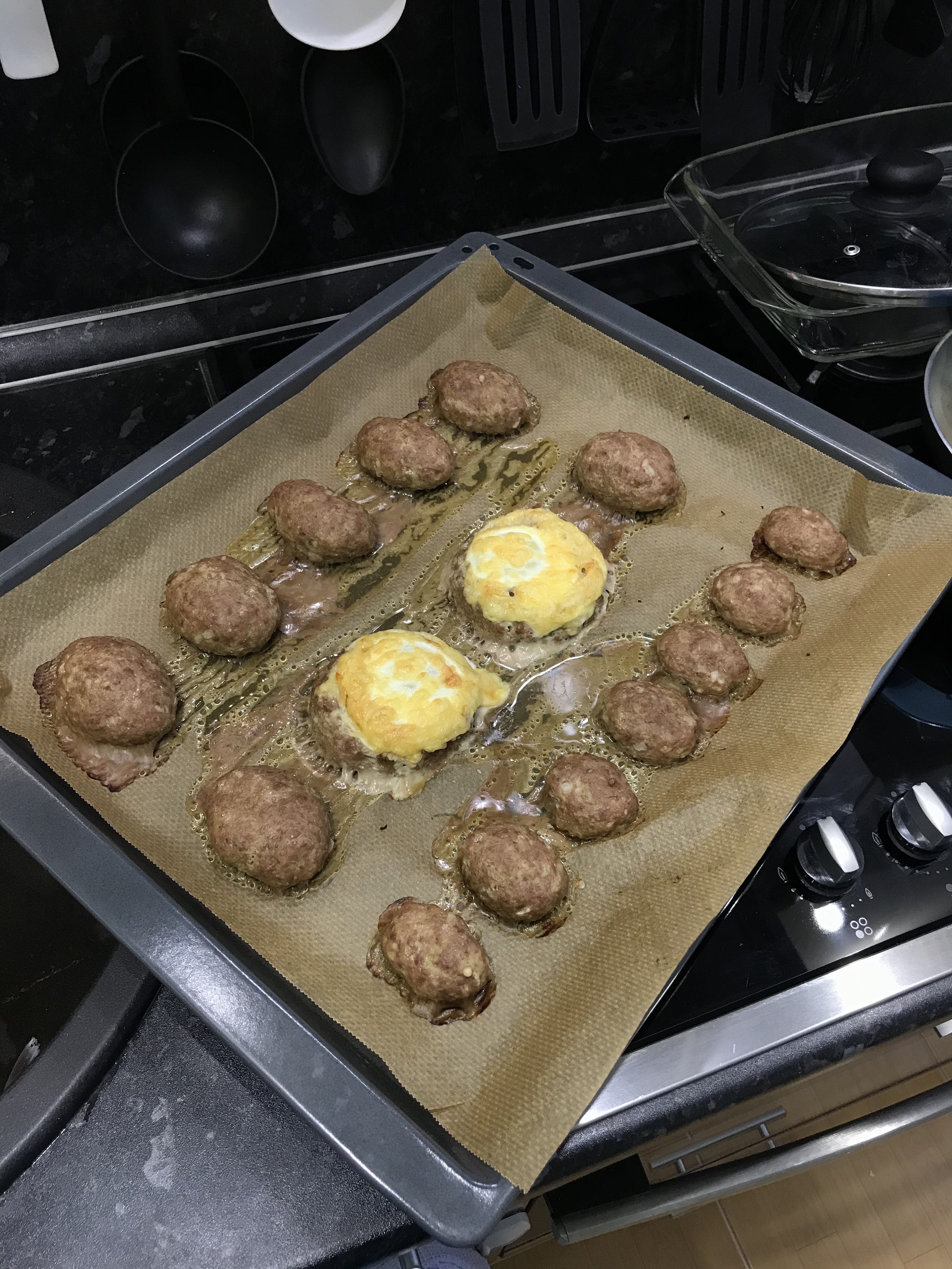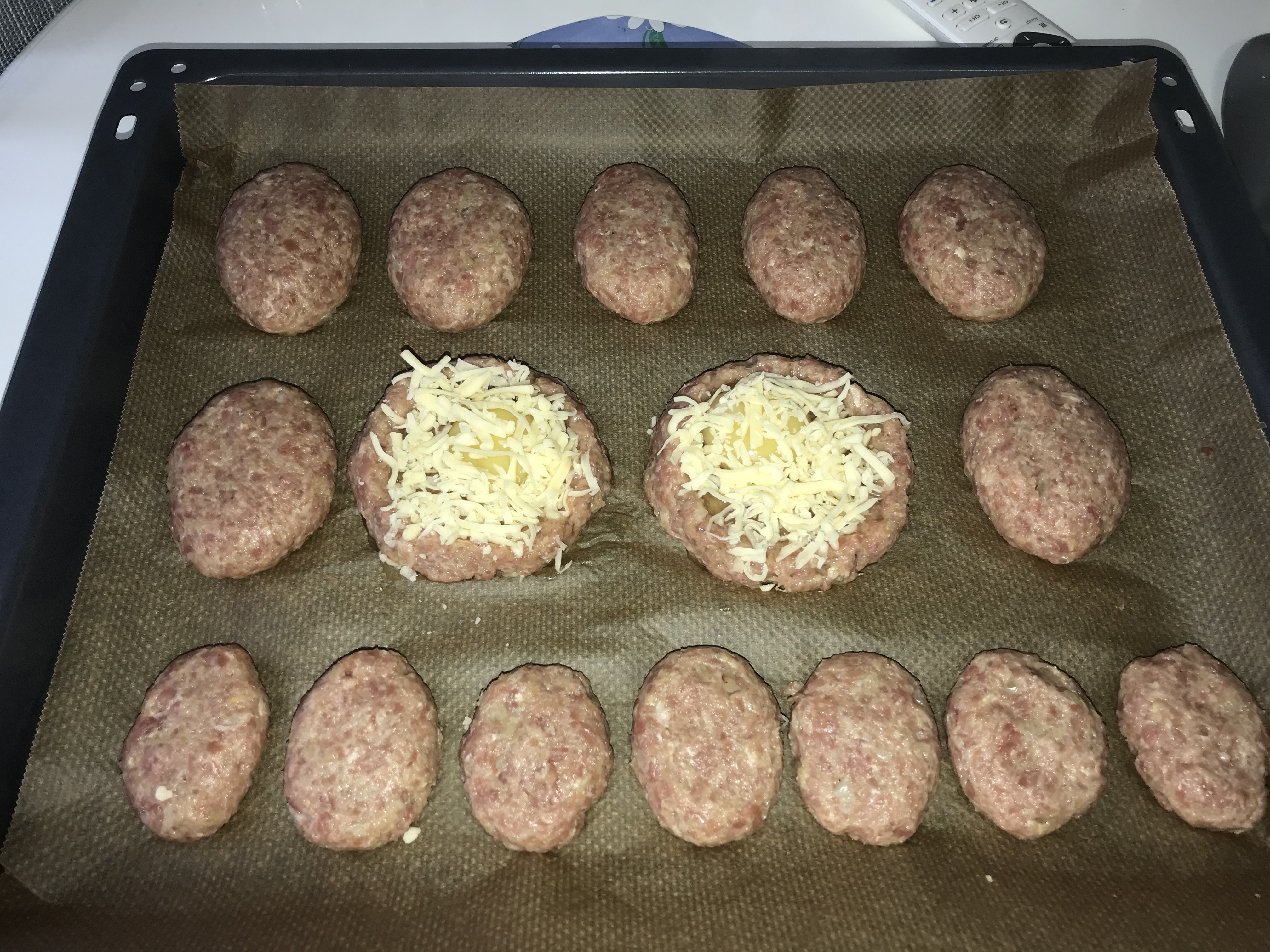 Котлеты из индейки. Гнезда. Фарш: - мясо бёдра индейки ~500гр - кабачок маленький 1 шт. - чеснок 1 зуб. - лук репчатый 1 шт. - батон в молоке 3 кус. - соль, перец, мускатный орех по вкусу Кабачок очистить, натереть на мелкой тёрке, отжать. Мясо, чеснок, лук, батон перекрутить. К мясу добавить кабачок и специи. Хорошо вымесить, несколько раз отбить. Я в руку весь фарш из чашки выкладываю и кидаю шлепаю обратно в чашу. Сформировать котлеты. В двух сделала углубления. И в этих гнёздах по яйцу и сверху сыр. Поставить в предварительно разогретую духовку до 180С на ~ 30 минут. Мини котлетки это для детей, любят мини формат)