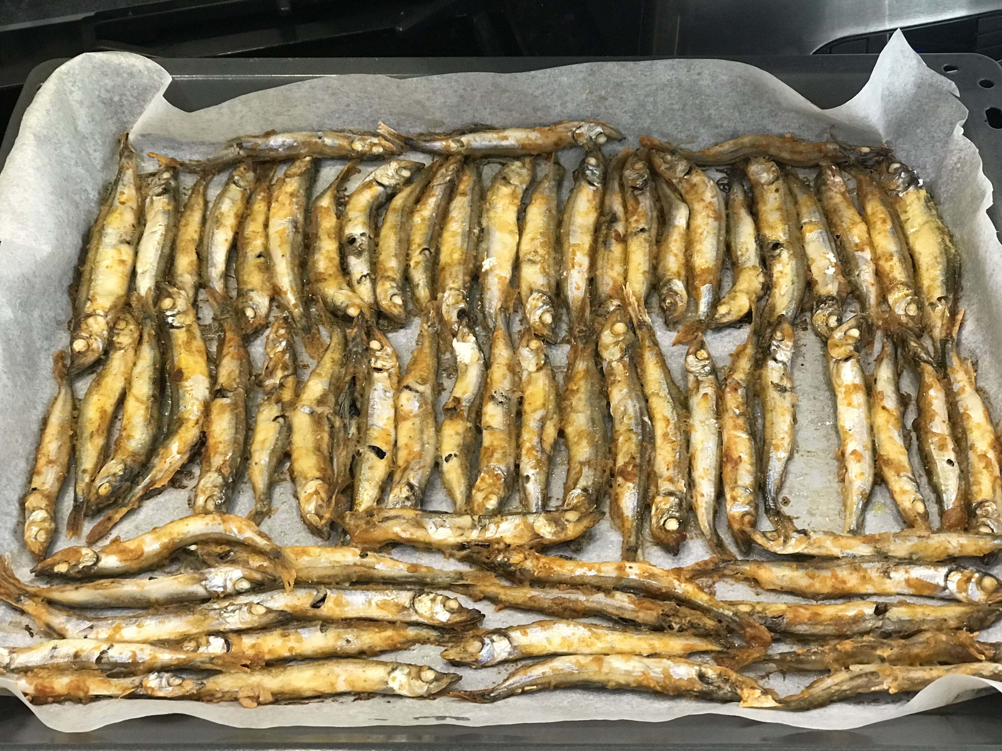 Мойва! В большой чаше посыпаем специями, мукой, паприкой и перемешиваем. На противень и в разогретую духовку минут на 20.