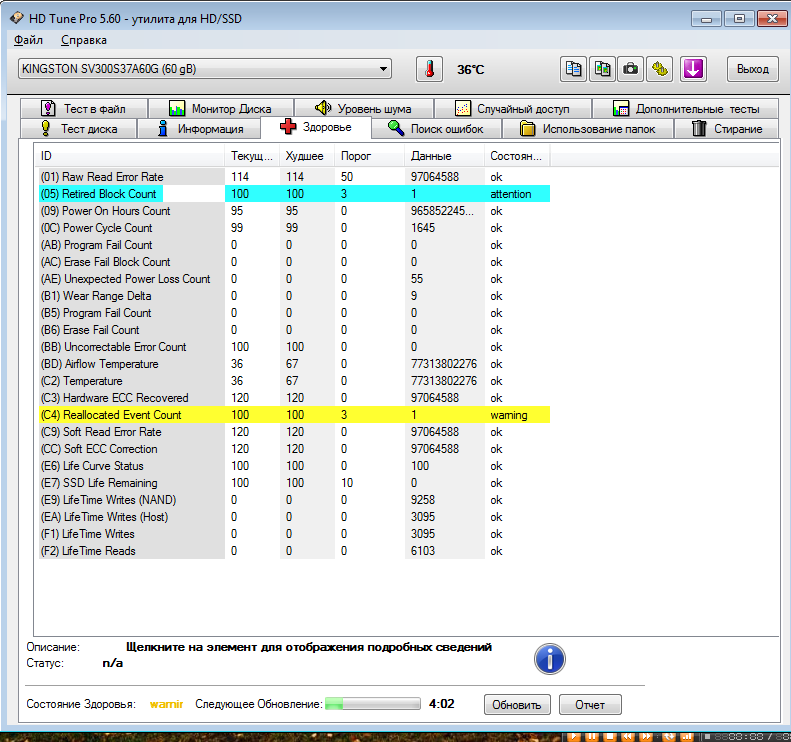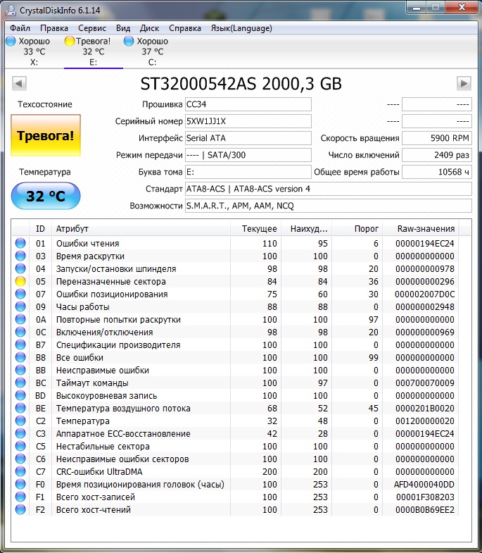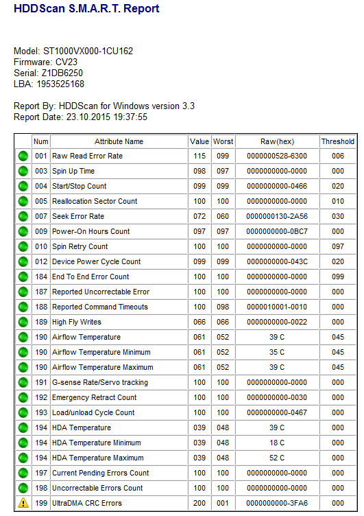 akrivcov, C5 - найден один (в твоем случае) сектор с ошибкой чтения. "Count of 'unstable' sectors (waiting to be remapped, because of unrecoverable read errors)." Подлежит ремаппингу. Если по каким-то причинам автоматика диска не может ремапить его "на ходу", нужно провести проверку диска подключив больного к др. машине. Желательно Викторией в режиме TEST READ (она умеет на ходу ремапить и заодно заново переписывать служебные треки). С7 - поперли ошибки передачи по шлейфу SATA. Шлейф - в помойку. После замены шлейфа, погонять день / два и проверить показания счетчика. Если значения растут - переткнуть на др.порт в материнке, и заново проверить. Э-ээээ! Зачем картинку поменял?!
