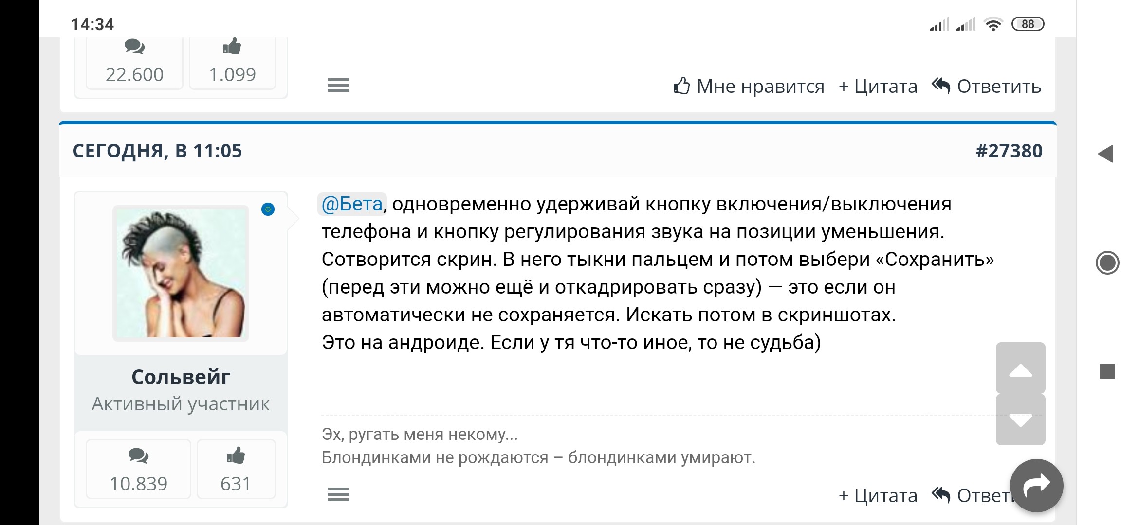 @Бета, одновременно удерживай кнопку включения/выключения телефона и кнопку регулирования звука на позиции уменьшения. Сотворится скрин. В него тыкни пальцем и потом выбери «Сохранить» (перед эти можно ещë и откадрировать сразу) — это если он автоматически не сохраняется. Искать потом в скриншотах. Это на андроиде. Если у тя что-то иное, то не судьба)