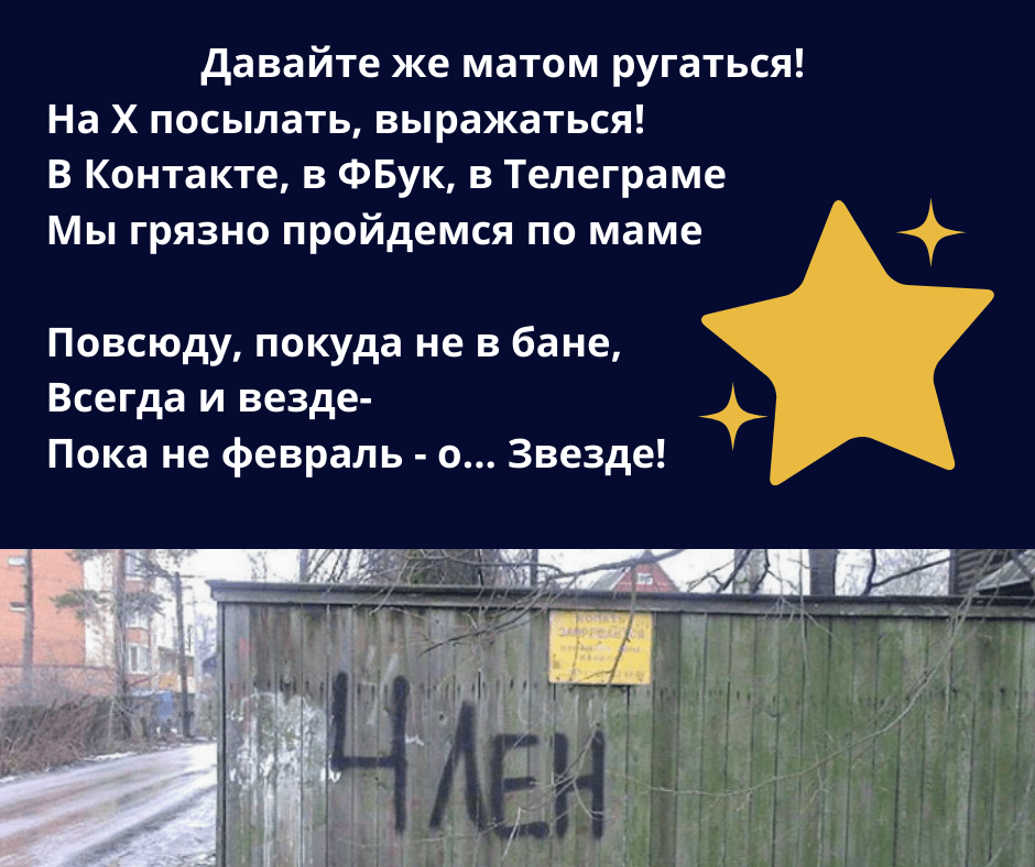 подражая Чуковскому Давайте же матом ругаться! на Х посылать, выражаться! В Контакте, в ФБук, в Телеграмме, Мы грязно пройдемся по маме ... И здеся, покуда не в бане, Всегда и везде - Пока не февраль - о Звезде! нет. это он не только ей, но и собачникам)
