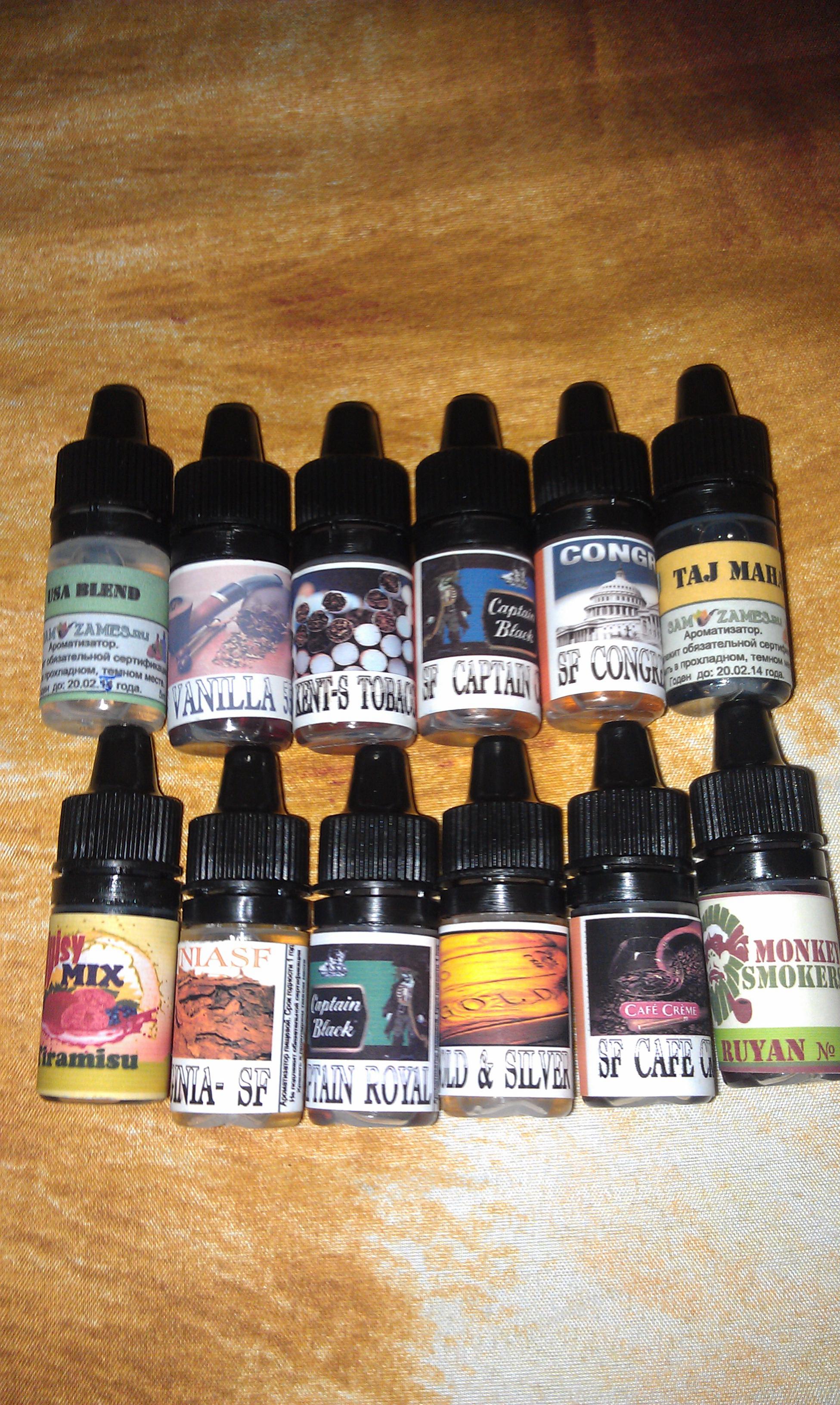 Ну не знаю, 100 рублей пузырек получился. Одного пузырька мне на долгое время хватит, тем более я до лета только успею все распробывать. Думаю до конца года мне вполне хватит. До этого всё время ксиановскими пользовался, из 20 мне только 4 понравилось, вот они дешевле. Я выше писал, что фруктовые мне не пошли, яблоко 50мг так и стоит. А так да, терамису и тадж махал, вроде ментол. Так среди табачек смотри какое разнообразие Вот у меня сейчас 4 табачки на постоянке. Голд Вирджиния-это самая любимая - сладкая табачка со вкусом печенек, на ее основе бывает еще чего примешиваю Сигар Черри-слабая табачка с насыщенным вкусом вишни. при чем чем больше я ее добавляю в основу, тем сильнее вкус ягоды Таинственный остров-слабая табачка с тонким вкусом шоколада. Вот её как раз больше добавлять надо, а то получается вкус дешевого шоколада И Олд капитан-достаточно сильный вкус табачки с вишней, чем больше аромки тем сильнее вкус табака, поэтому этой аромки мне на год хватит, уходит чуток. Ну и часто в основу с голд вирджинией подмешиваю то одну, то другую уже готовую жидкость. У меня дрипка, поэтому не сложно ---------- Сообщение добавлено 14.03.2014 09:39 ---------- Антоша, Давай колись, обсудим, загнобим