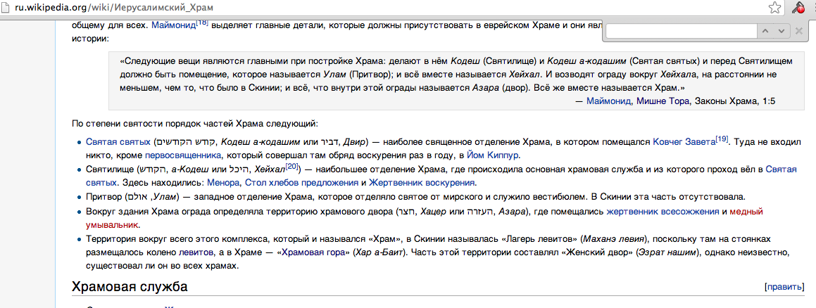 Замечательно - храмов было несколько. Я вроде вполне понятно спросил про Христа и что было до него как-то мало интересовало в том вопросе. Но как я и писал, ладно, это был вопрос сугубо моего интереса. А что Вас смущает, когда в жизнеописании пишут одну из страниц жизни, так сказать? Если она там жила, то почему бы об этом не писать? Это не повышает статус Богородицы - она в этом не нуждается, но как часть биографии почему нет. Ну понятно, такое конкретное и такое охраняемое, что Вы даже не знаете о чём пишите. Вы знаете что такое Соломонов притвор? Может покажете его на том рисунке, что Вы приводили? А меж тем это часть храма или храмовой территории, как Вам угодно. Не знаете сколько он там был в локтях? Так что же Вы тогда требуете указать точку на карте? Напоминает эпизод из книги "Несвятые святые": Странно рассуждать про ангажированность, приводя в пример иудейские тексты, правда? Вы слышали о Брурии? Может сможете привести не ангажированные источники про её жизнь? Почитаем, поговорим. Это Вы требование выдвигаете или угрожаете? Читайте, читайте Шмуэля Сафраи, между прочим очень почитаемого иерусалимского профессора. Ааааааа, а то я не так понял Вас. Конечно Давиду не надо было быть сверхчеловеком, так карта легла, да? Вы случайно игрот кодешь не читали? А то там написано про Мессию, сына Иосифа (не волнуйтесь, не тот Иосиф имеется ввиду) и про Мессию, сына Эфраима (это уже сам сын Иосифа). Как Вы понимаете это не род Давида совершенно и этот Мессия погибает в борьбе, очистив место для настоящего Мессии. Круто да? Без разницы, что в торе нет ничего про двух Мессий, а в талмуде (в игрот кодеше, который писался уже в наше эре) есть. Про ангажированность ещё будем или довольно пока?