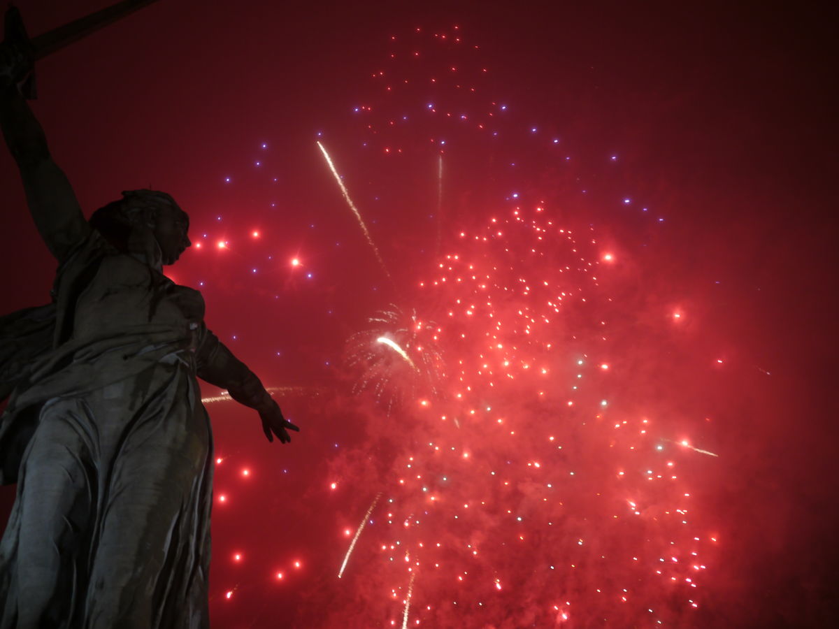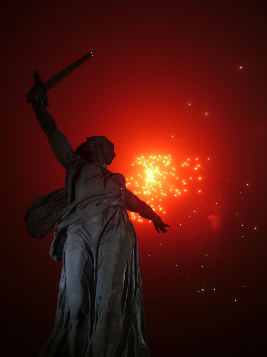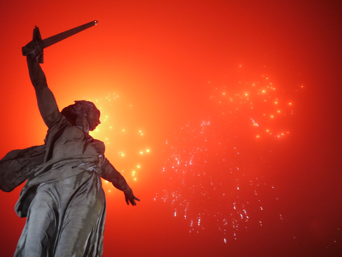 Салют в 18.00 на Мамаевом кургане. Световое представление (7 минут) в 18.30 на площади Павших борцов.