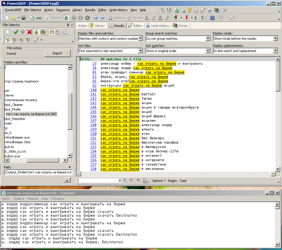 Народ, кто в теме. Никак не могу настроить прогу чтобы выбирала ключи в которых искомая фраза была бы НЕ в точном совпадении.. Пример: "как играть не бирже" - не находит "как играть и выигрывать на бирже" На скринах вообще первые строки из текстовика подходят, а PowerGREP выбирает с 27 строки...