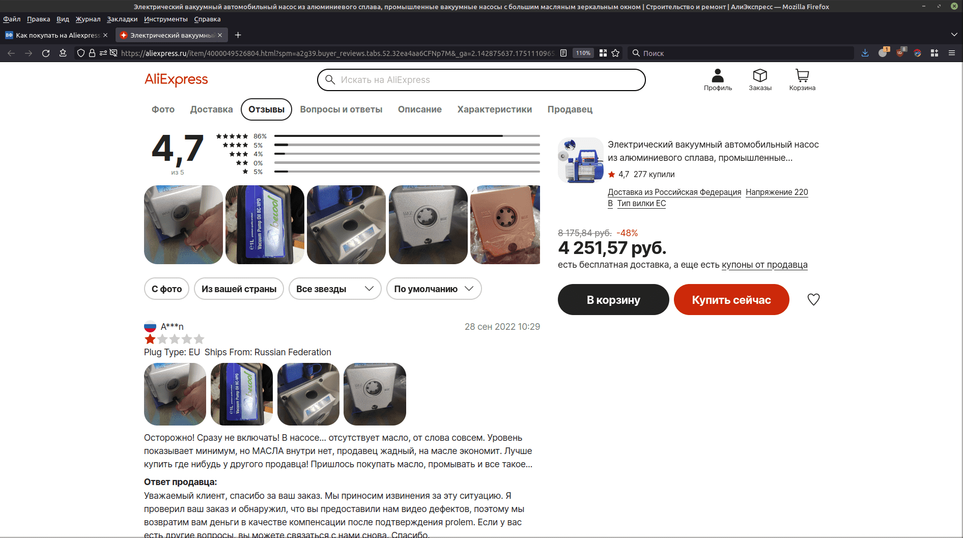 Вот тут мой отзыв: https://aliexpress.ru/item/40000495...589244508.1632219479&sku_id=12000030807636612 Одна звезда, начинается так: Осторожно! Сразу не включать! В насосе... отсутствует масло, от слова совсем. Посмотрите, покажет другим этот отзыв или нет?