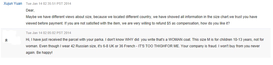 Cruel Eve,я не отжала ничего, он предложил мне 2 бакса, я его послала к егерям. мне прислали НЕ ТОТ ЦВЕТ И НЕ ТОТ РАЗМЕР!!!!с корявой биркой и вообще не то, что я ожидала... ТО, ЧТО ОН МНЕ НАПИСАЛ НА КОРЯВОМ АНГЛИЙСКОМ Я ПОНЯЛА ПРЕКРАСНО, я не знаю, как лучше поступить в данной ситуации....