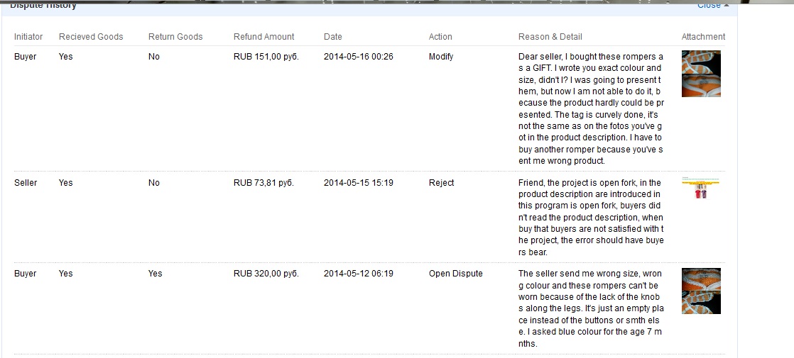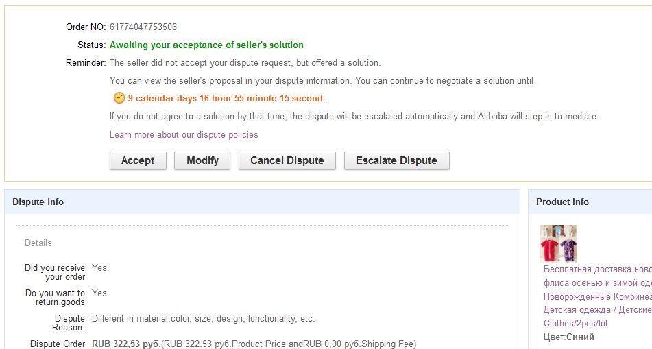 А там чего, в описании у продавца написано дженуин квалити? )) Любят они такое. Предложение продавца не принимай, что там за кнопка "Редактировать"? Ладно, фиг с этой кнопкой )) Напиши "Прошу выслать комбинезон того цвета и размера, который я заказывала". У тебя чего-нить осталось в твоих заказах? Картинка синего комбеза и возраст? Или там было написано типа: "Много цветов, при заказе пишите цвет и возраст"? ---------- Сообщение добавлено 16.05.2014 09:58 ---------- Всё, увидел, извиняюсь. Тогда какие вопросы? Пиши, чтобы прислал то, что заказывала. И всё, больше ничего не пиши. Если тебе нужны деньги, пиши, что "я уже заказала синий на 7 месяцев у другого продавца, посылка придёт через 5 дней и Ваше предложение выслать синий комбез для меня неактуально" ---------- Сообщение добавлено 16.05.2014 10:00 ---------- И имя с фамилией затирай )))