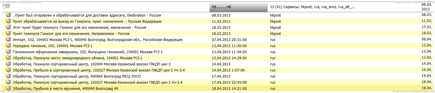Вот, только проговорили - случилось чудо 10.03.2013 12:25 Поступило на почту Китая 21526600 21526600 17.03.2013 14:29 Поступило в транзитный пункт Сучжоу 17.03.2013 20:15 Отправлено из транзитного пункта Сучжоу 9.05.2013 15:21 Импорт Москва PCI-1 Так что ждем товарищи ) ---------- Сообщение добавлено 09.05.2013 21:13 ---------- Nazarych, ну вот, так что стоит Вам наверное тоже подождать