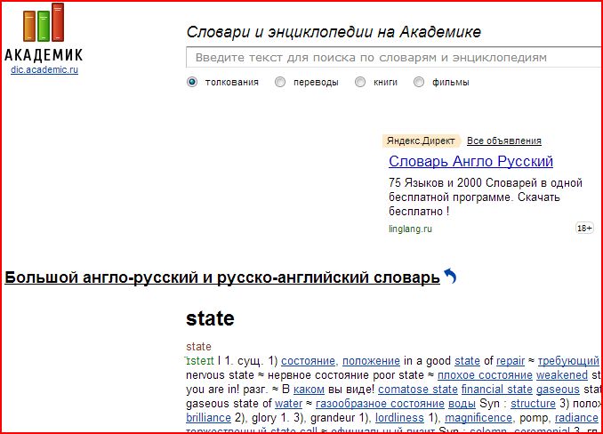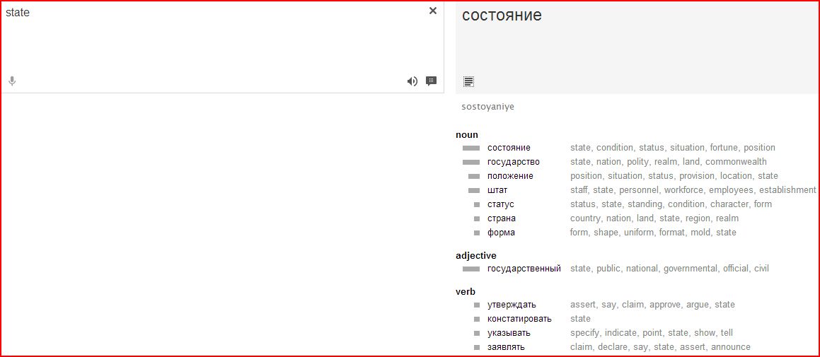 rr, дальше смотрим чем релевантный псевдословарь отличается от настоящего: http://dic.academic.ru/dic.nsf/eng_rus/767504/state сущ.: государство.