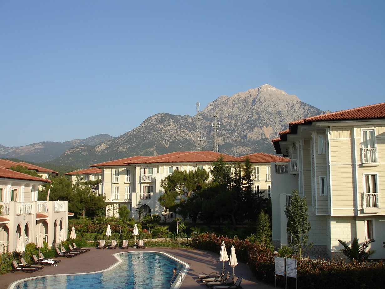 Stacy, ход ваших мыслей мне нравится, но хочется услышать и другие варианты) Подсказка №1: дневные фото отличаются от утренних (сейчас специально прогулялась, чтобы лишний раз убедиться в правильности своих наблюдений, а заодно сделать несколько подтверждающих кадров). Сейчас покажу вам кусочек виллы, где мы живем (я любовалась горой Тахталы поэтому она просто попала в кадр) вилла в 2 этажа с выходом из номеров к бассейну. 3х этажные домики отгорожены от неё живой изгородью (поверх металлического заборчика) так что это вполне приватная зона без доступа посторонних. У каждого такого бассейна стоит вышка со спасателем, который дежурит часов с 10 утра и до вечера. независомо от того, купается ли кто-нибудь или нет. бассейн глубиной 1.4. А бассейнов на территории отеля очень много.