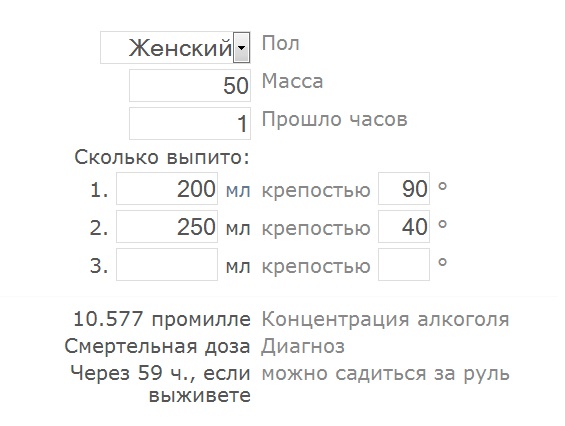 4 рюмки самогона и где-то 5-6 водки. ---------- Сообщение добавлено 05.05.2013 09:00 ---------- Надеюсь,что реальные промилле считаются иначе,у меня всегда какие-то нереальные цифры..:frustrate