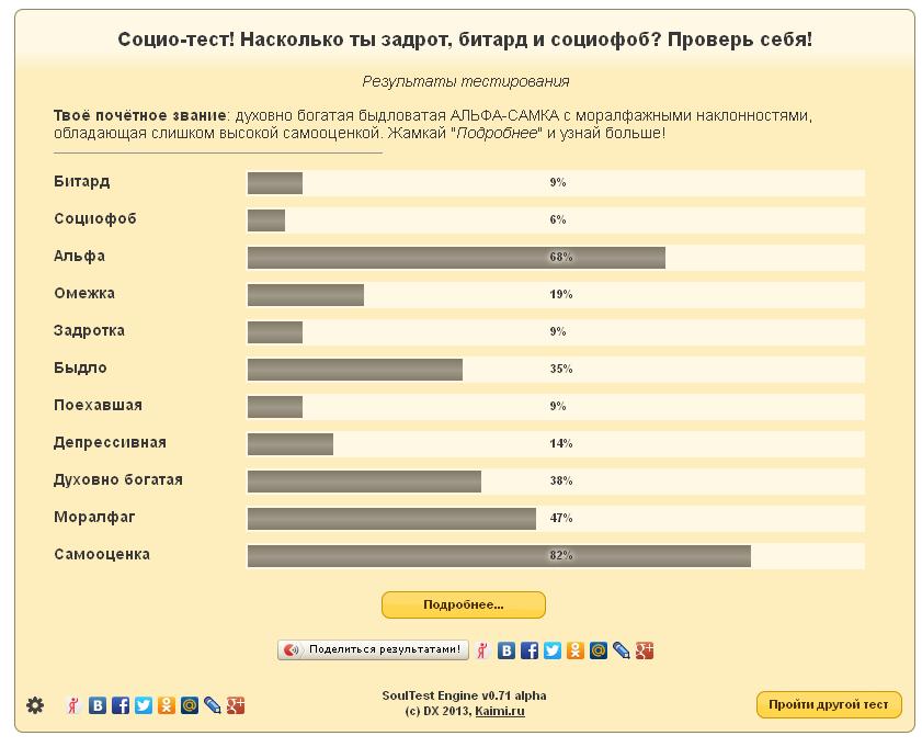 а прикольная штука, прям в цвет вышло ---------- Сообщение добавлено 01.11.2013 03:52 ---------- Результаты тестирования Твоё почётное звание: депрессивный быдловатый АЛЬФАЧ с задротскими пристрастиями с аморальным отношением к жизни с нормальной самооценкой. Битард 22% С этим всё хорошо, и показатель в пределах нормы. Можно быть слегка битардом, это позволяет легко относиться к жизни и проще решать возникающие проблемы. Наверняка ты не слишком подвержен троллингу, да и сам не прочь в нем поучаствовать, но в меру. А учитывая весьма развитые качества альфача, можно с уверенностью сказать, что дальше в питурдизм ты едва ли скатишься. Социофоб 18% Очень хорошо, что у тебя почти нет социофобии. Ты легко общаешься, люди считают тебя достаточно интересным человеком. Обрати на это внимание: умение общаться с людьми - это твоя сильная сторона. Стоит развивать эти навыки, если они в тебе уже есть. И очень хорошо, что ты не очень омежен. Твои социальные навыки, по всей видимости, развиты достаточно хорошо, и среди людей ты можешь чувствовать себя, как рыба в воде. Ну а наличие качеств альфача как нельзя кстати приходится в твоей ситуации. Альфач 57% Пожалуй, у тебя самый оптимальный уровень альфа-качеств. Не много и не мало, то, что нужно для хорошей беззаботной жизни в обществе. Человек - социальное существо, и твой альфа-уровень позволяет идеально встроиться в коллектив. Ты можешь выбирать и контролировать, когда быть слегка незаметным, а когда - лидером. Людям это нравится, так как ты не слишком доминируешь над остальными. К твоему счастью, ты не обладаешь слишком глубоким духовным богатством, и, похоже, твои качества альфача используются именно для того, чтобы получше устроиться в обществе, среди людей. Омежка 4% Можешь радоваться - ты не омега. Ты не стыдишься себя в обществе, способен многое решать сам, без посторонней помощи. Ты достаточно самостоятельный и морально зрелый человек, и этим стоит гордиться. Если учесть, что ты не социофоб, то складывается впечатление, что у тебя совсем нет проблем с общением. Да и как может быть омегой человек, который дофига альфач? ****** 24% Ты задрачиваешь всякие интересные тебе вещи в меру. Уровень в норме, только если ты не тратишь всё своё время исключительно на компьютерные игры. Судя по твоей альфовости, ты привык вкладывать больше времени в полезные для собственного развития дела, чем в компьютерные игры. Быдло 38% Ты слегка быдловатый паренек. Уровень быдлоты в норме. Ты можешь поддерживать легкое общение не только с тихими омежками, но и с альфачами и духовно богатыми быдланами. Ты типичный слегка быдловатый альфа. Пожалуй, это достаточно удачная комбинация для того, чтобы люди не отвернулись от тебя. Но всё же не каждый станет общаться с таким человеком. Поехавший 14% Радуйся - ты не псих и не поехавший. Данный показатель полностью в норме. Люди не будут видеть в тебе ненормального человека, твоё поведение адекватно (если только ты сам не захочешь вести себя как идиот). А адекватность вместе с качествами альфача - очень полезное свойство для того, чтобы завоёвывать симпатию людей. Однако, у тебя есть какие-то депрессивные настроения. Стоит проследить за этим - это может подорвать твоё психическое здоровье. Депрессия у тебя выражена слабо, и, вероятно, ты уже работаешь над собой. Придерживайся правильного пути! Депрессивный 38% Вниман