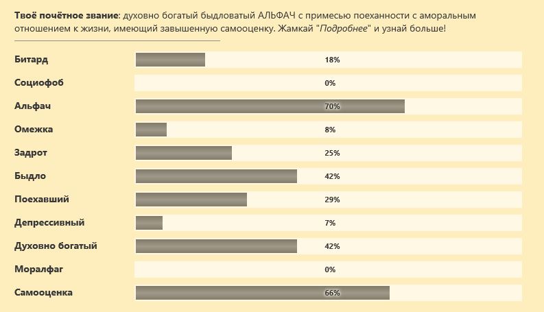 Твоё почётное звание: духовно богатый быдловатый АЛЬФАЧ с примесью поеханности с аморальным отношением к жизни, имеющий завышенную самооценку. Жамкай "Подробнее" и узнай больше! Битард 18% С этим всё хорошо, и показатель в пределах нормы. Можно быть слегка битардом, это позволяет легко относиться к жизни и проще решать возникающие проблемы. Наверняка ты не слишком подвержен троллингу, да и сам не прочь в нем поучаствовать, но в меру. А учитывая весьма развитые качества альфача, можно с уверенностью сказать, что дальше в питурдизм ты едва ли скатишься. Но будь осторожен: уровень твоего духовного богатства достаточно высок, и так можно стать совершенно тупым идиотом (ко-ко-ко, я нитакойкакфсе). Это убьет всю пользу от твоего легкого восприятия троллинга, ты начнешь все шутки людей, направленные в твой адрес или в адрес твоих единомышленников, воспринимать на свой счет и очень близко к сердцу. Социофоб 0% Очень хорошо, что у тебя почти нет социофобии. Ты легко общаешься, люди считают тебя достаточно интересным человеком. Обрати на это внимание: умение общаться с людьми - это твоя сильная сторона. Стоит развивать эти навыки, если они в тебе уже есть. И очень хорошо, что ты не очень омежен. Твои социальные навыки, по всей видимости, развиты достаточно хорошо, и среди людей ты можешь чувствовать себя, как рыба в воде. Ну а наличие качеств альфача как нельзя кстати приходится в твоей ситуации. Альфач 70% . Да ты практически альфа-самец! Очень высокий уровень таких качеств позволяет тебе легко идти по жизни, и лишь тихие омежки и социофобы будут тебе завидовать. Жизнь тебе дается легко, и ты не паришься над проблемами. Ты способен доминировать над многими людьми, завоевывать уважение. Многие пойдут за тобой и будут подчиняться. Омежка 8% Можешь радоваться - ты не омега. Ты не стыдишься себя в обществе, способен многое решать сам, без посторонней помощи. Ты достаточно самостоятельный и морально зрелый человек, и этим стоит гордиться. Если учесть, что ты не социофоб, то складывается впечатление, что у тебя совсем нет проблем с общением. Да и как может быть омегой человек, который дофига альфач? ****** 25% Ты задрачиваешь всякие интересные тебе вещи в меру. Уровень в норме, только если ты не тратишь всё своё время исключительно на компьютерные игры. Похоже, ты тратишь своё время на духовное обогащение (проще говоря, становишься ТП). Судя по твоей альфовости, ты привык вкладывать больше времени в полезные для собственного развития дела, чем в компьютерные игры. Быдло 42% Уровень твоей быдлоты на достаточно высоком уровне. Будь осторожен - люди могут воспринимать тебя как человека, у которого нет ценностей в жизни, который ничего и никого не уважает и не ценит. Впрочем, если ты найдешь себе подходящую компанию, тебя это беспокоить вряд ли будет. Ты слегка отгораживаешь свои быдло-черты от людей, проявляя альфа-качества. Но любой человек раскусит в тебе быдлана при желании. Поехавший 29% Ты в некотором роде ненормальный. Скорее всего, у тебя нет серьезных психических отклонений, но, возможно, ты упарываешь какие-то вещества и алкоголь, и это слегка подрывает твоё душевное здоровье. Не исключено, что ты слишком зацикливаешься и едешь из-за мыслей о том, что нормальные люди считают хернёй. Ты становишься тупой пиздой, а у таких людей с головой частенько не в порядке, хотя сам