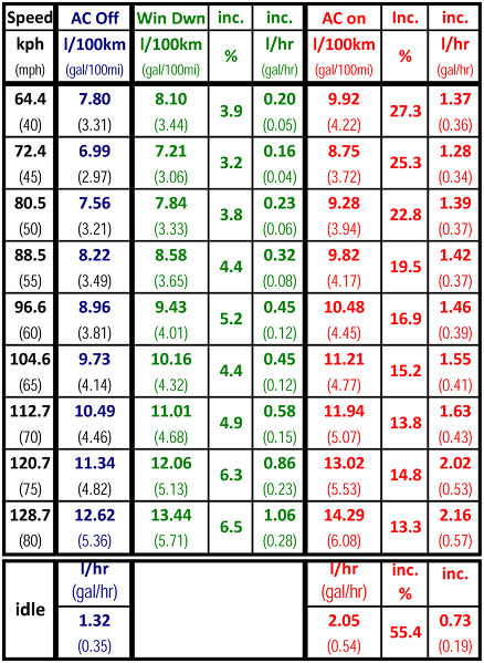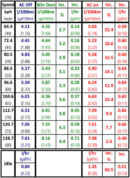 Дам вам немного фактов, господа, что-бы развеять субъективные ощущения. Буквально вчера попало в руки исследование, проведённое в Oak Ridge National Laboratory по заказу U.S. Department of Energy. В данном исследовании был изучен повышенный расход топлива при а. полностью открытых 4х окнах, б. включенном на 100% нагрузки кондиционер в. включенном примерно на 50% нагрузки ( до температуры примерно в 22,5°) При исследовании естественно были идентичные температурные условия, как и влажности воздуха. Испльзовались 2 разных автомобиля - Ford Explorer 2009 4.0 V6 и Toyota Corolla 2009 с мотором 1,8 I4. В данной таблице виден расход Короллы на разных скоростях с выключенным кондиционером, открытыми окнами и включенным на полную мощность кондиционером Эти данные хорошо видны на этом графике В этой таблице виден расход Короллы на скорости в 80км/ч с выключенным кондиционером, включенным на 50% и включенным на полную мощность Тоже самое видно по Форду Эксплореру